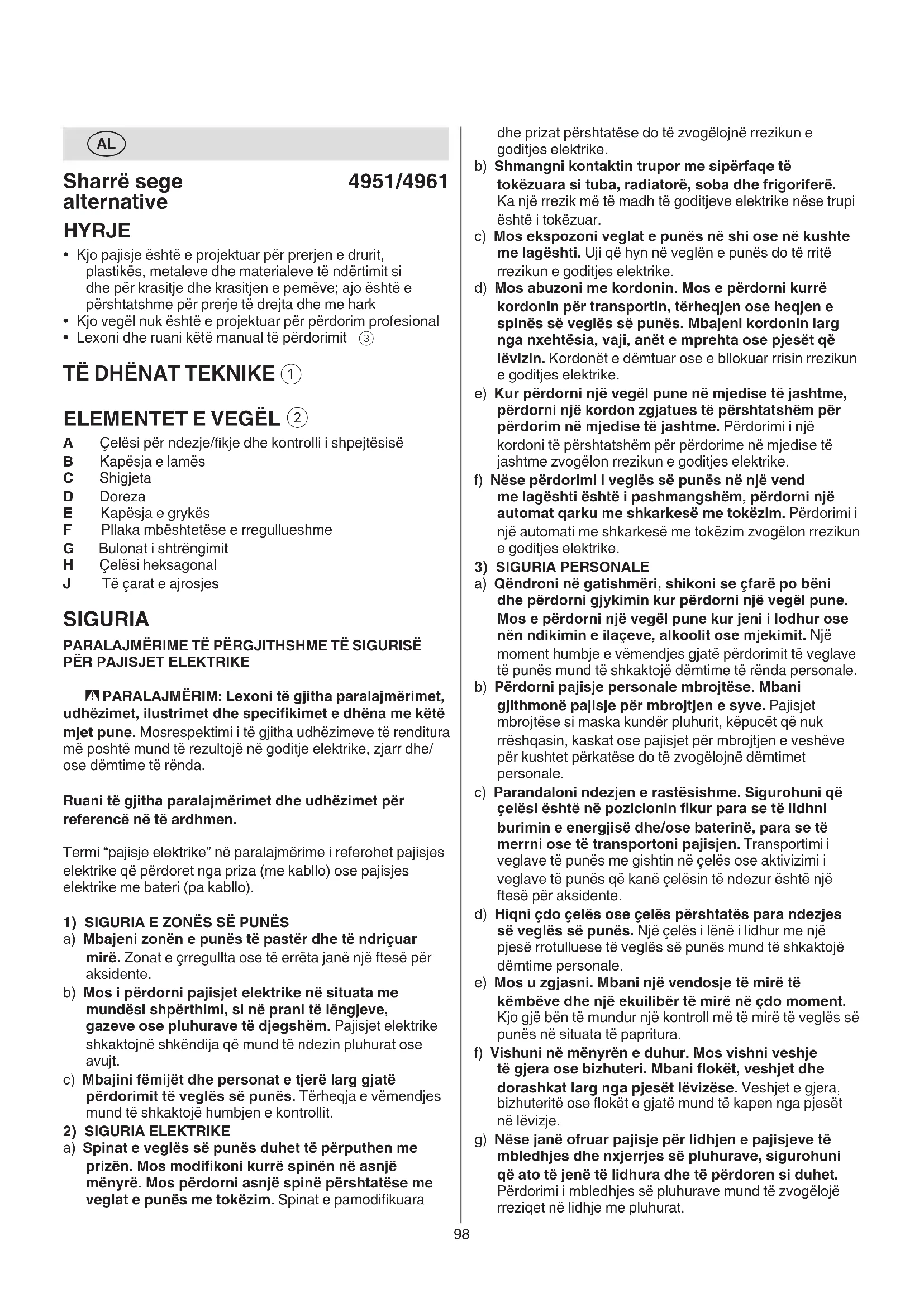 A Çelësi për ndezje/kje dhe kontrolli i shpejtësisë B Kapësja e lamës C Shigjeta D Doreza E Kapësja e grykës F Pllaka mbështetëse e rregullueshme G Bulonat i shtrëngimit H Çelësi heksagonal J Të çarat e ajrosjes SIGURIA PARALAJMËRIME TË PËRGJITHSHME TË SIGURISË