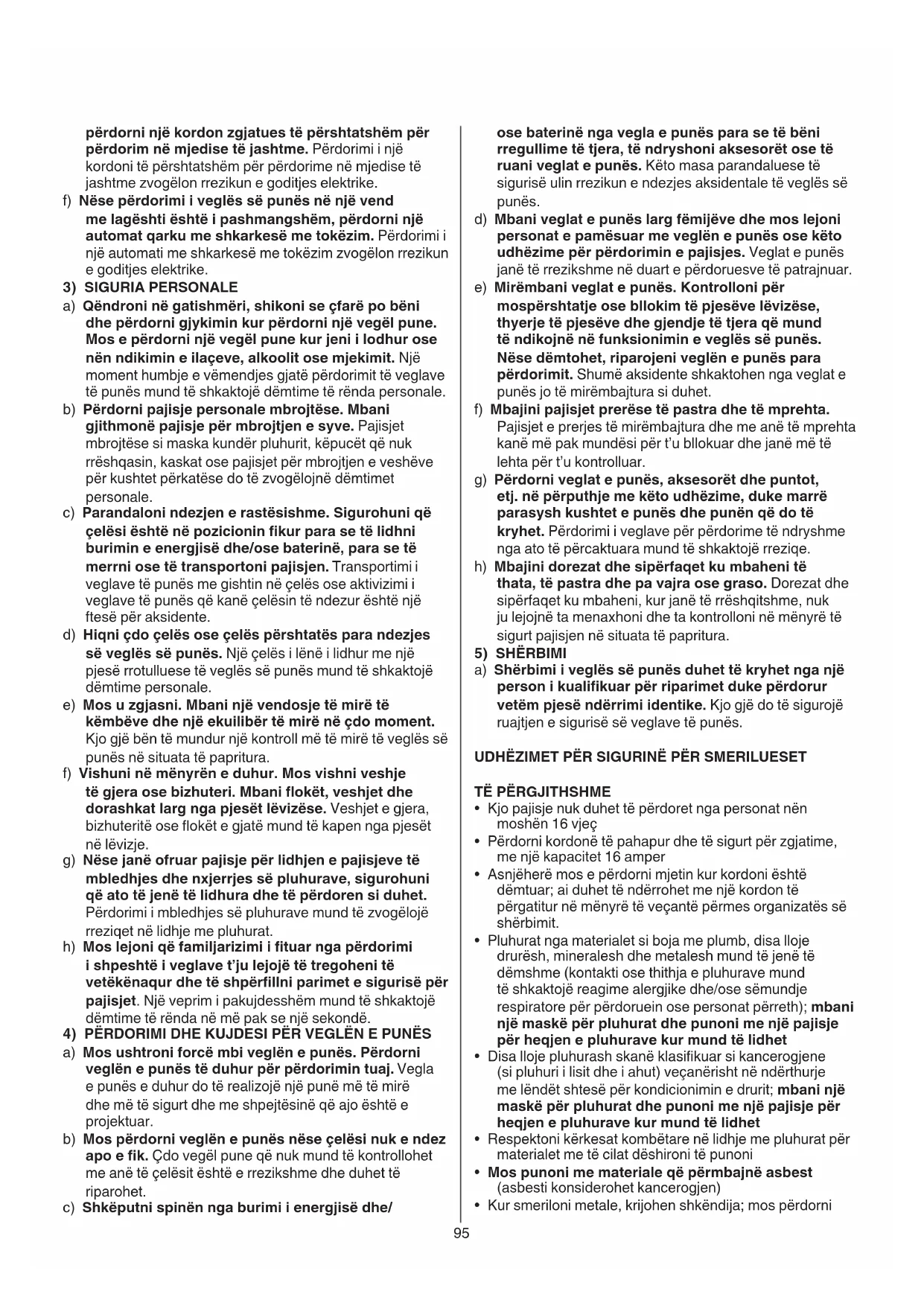 a) Mos ushtroni forcë mbi veglën e punës. Përdorni veglën e punës të duhur për përdorimin tuaj. Vegla e punës e duhur do të realizojë një punë më të mirë dhe më të sigurt dhe me shpejtësinë që ajo është e projektuar. b) Mos përdorni veglën e punës nëse çelësi nuk e ndez apo e k. Çdo vegël pune që nuk mund të kontrollohet me anë të çelësit është e rrezikshme dhe duhet të riparohet. c) Shkëputni spinën nga burimi i energjisë dhe/96 i punës, duhet ta ndizni pajisjen ! para se ta kni veglën, ju duhet ta ngrini atë nga materiali i punës