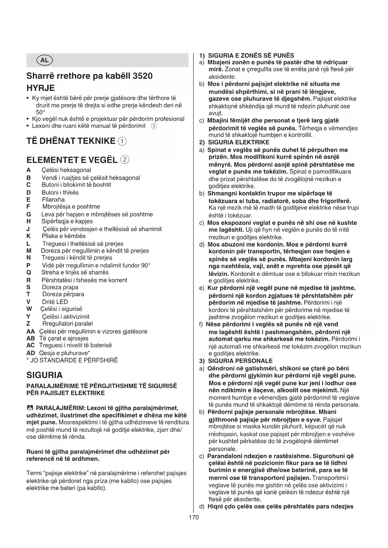 - PARALAJMËRIM: Lexoni të gjitha paralajmërimet, udhëzimet, ilustrimet dhe specikimet e dhëna me këtë mjet pune. Mosrespektimi i të gjitha udhëzimeve të renditura më poshtë mund të rezultojë në goditje elektrike, zjarr dhe/ ose dëmtime të rënda. Ruani të gjitha paralajmërimet dhe udhëzimet për referencë në të ardhmen. Termi “pajisje elektrike” në paralajmërime i referohet pajisjes elektrike që përdoret nga priza (me kabllo) ose pajisjes elektrike me bateri (pa kabllo).171