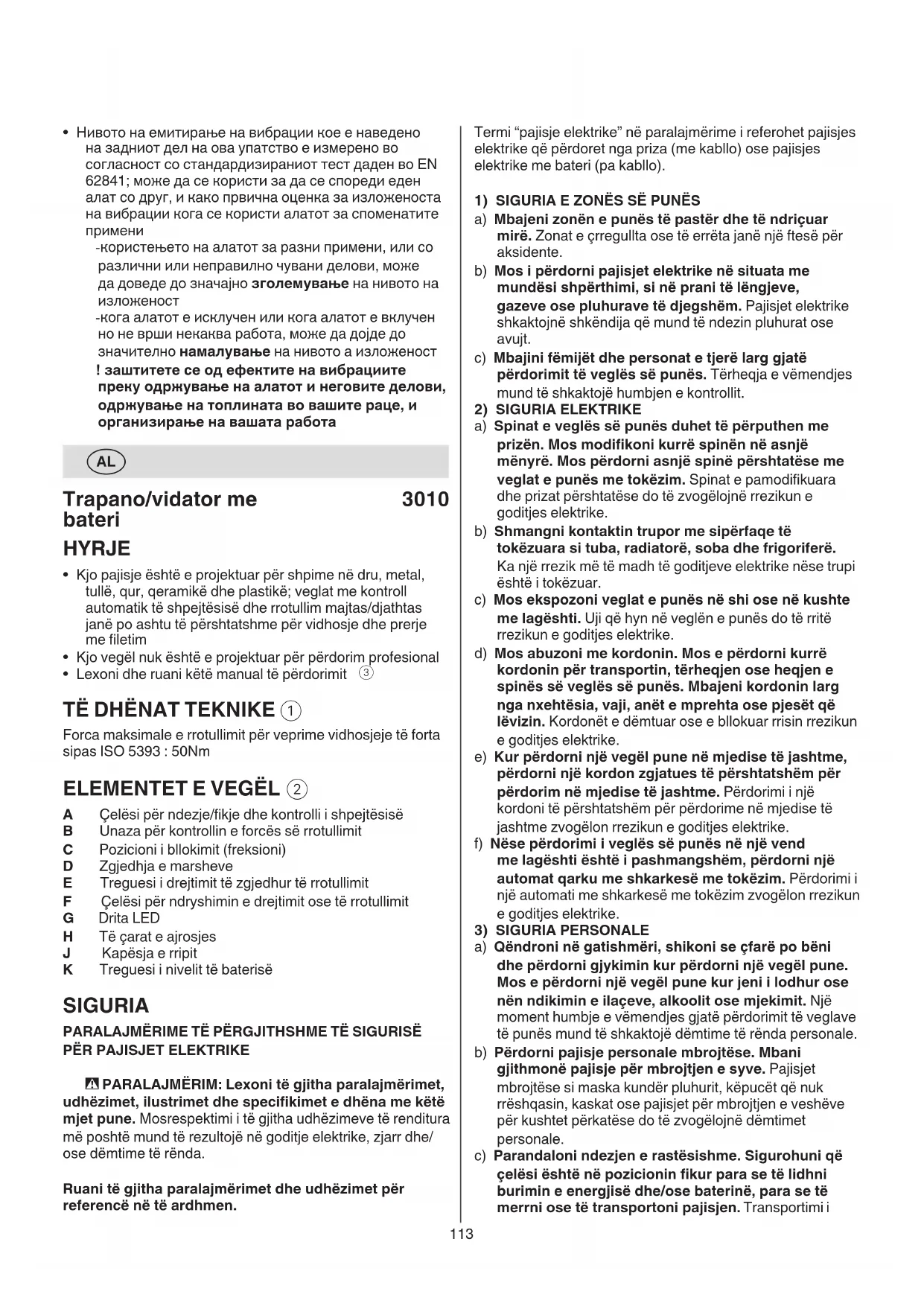 - PARALAJMËRIM: Lexoni të gjitha paralajmërimet, udhëzimet, ilustrimet dhe specikimet e dhëna me këtë mjet pune. Mosrespektimi i të gjitha udhëzimeve të renditura më poshtë mund të rezultojë në goditje elektrike, zjarr dhe/ ose dëmtime të rënda. Ruani të gjitha paralajmërimet dhe udhëzimet për referencë në të ardhmen.114 thata, të pastra dhe pa vajra ose graso. Dorezat dhe sipërfaqet ku mbaheni, kur janë të rrëshqitshme, nuk ju lejojnë ta menaxhoni dhe ta kontrolloni në mënyrë të sigurt pajisjen në situata të papritura.