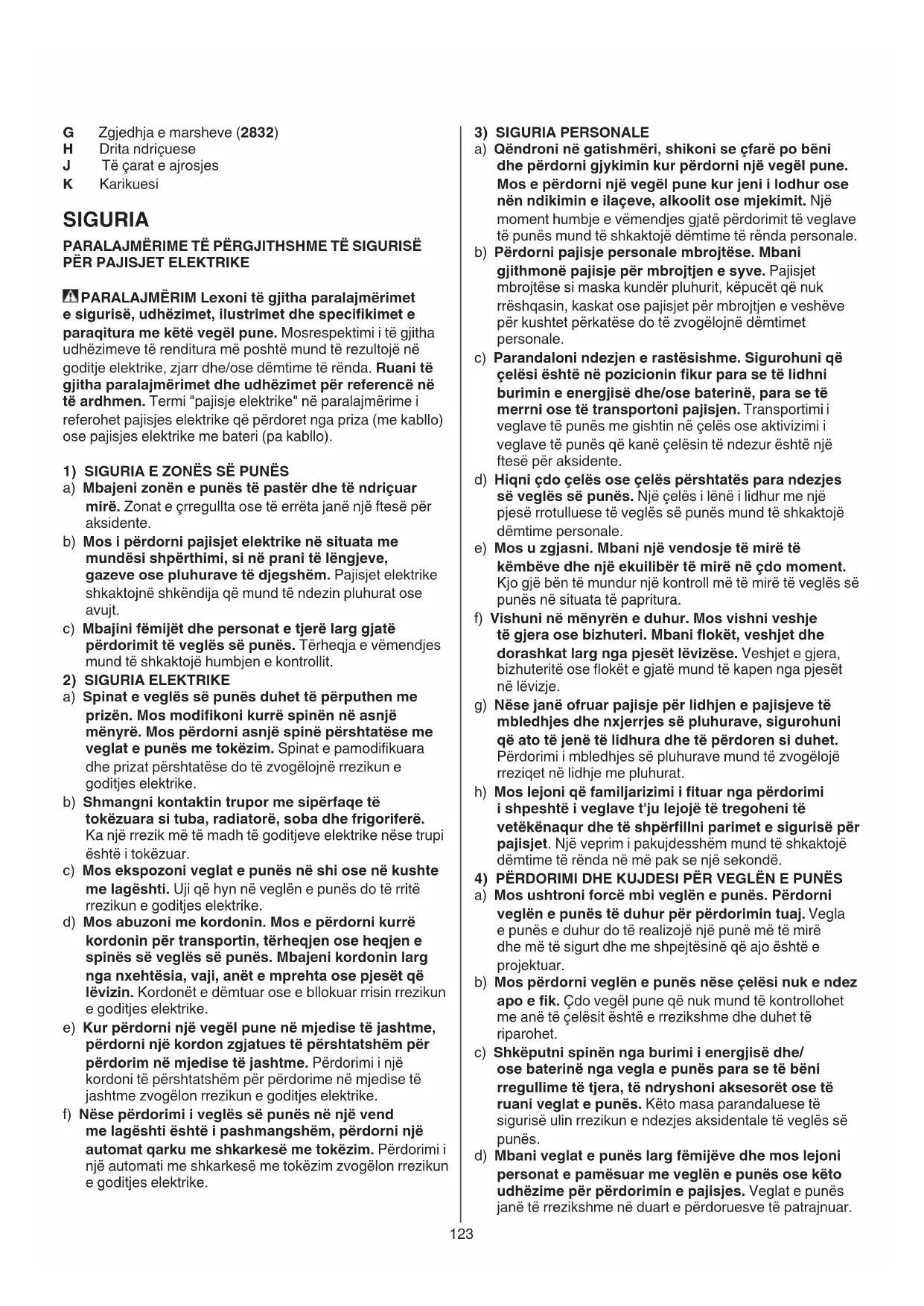 a) Mos ushtroni forcë mbi veglën e punës. Përdorni veglën e punës të duhur për përdorimin tuaj. Vegla e punës e duhur do të realizojë një punë më të mirë dhe më të sigurt dhe me shpejtësinë që ajo është e projektuar. b) Mos përdorni veglën e punës nëse çelësi nuk e ndez apo e k. Çdo vegël pune që nuk mund të kontrollohet me anë të çelësit është e rrezikshme dhe duhet të riparohet. c) Shkëputni spinën nga burimi i energjisë dhe/ ose baterinë nga vegla e punës para se të bëni rregullime të tjera, të ndryshoni aksesorët ose të ruani veglat e punës. Këto masa parandaluese të sigurisë ulin rrezikun e ndezjes aksidentale të veglës së punës. d) Mbani veglat e punës larg fëmijëve dhe mos lejoni personat e pamësuar me veglën e punës ose këto udhëzime për përdorimin e pajisjes. Veglat e punës janë të rrezikshme në duart e përdoruesve të patrajnuar. G Zgjedhja e marsheve (2832) H Drita ndriçuese J Të çarat e ajrosjes K Karikuesi SIGURIA PARALAJMËRIME TË PËRGJITHSHME TË SIGURISË