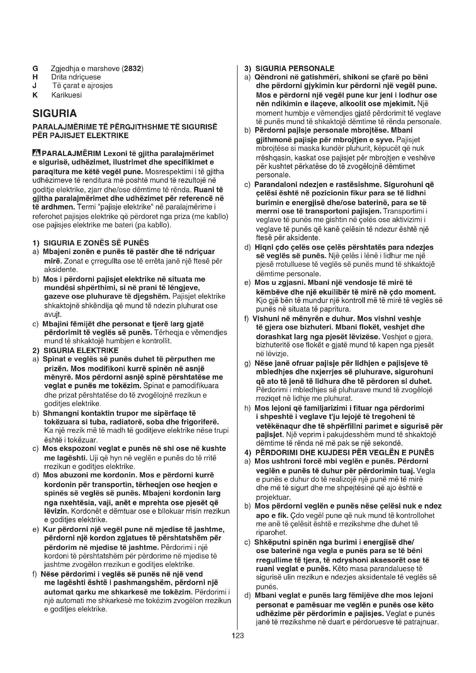 a) Mos ushtroni forcë mbi veglën e punës. Përdorni veglën e punës të duhur për përdorimin tuaj. Vegla e punës e duhur do të realizojë një punë më të mirë dhe më të sigurt dhe me shpejtësinë që ajo është e projektuar. b) Mos përdorni veglën e punës nëse çelësi nuk e ndez apo e k. Çdo vegël pune që nuk mund të kontrollohet me anë të çelësit është e rrezikshme dhe duhet të riparohet. c) Shkëputni spinën nga burimi i energjisë dhe/ ose baterinë nga vegla e punës para se të bëni rregullime të tjera, të ndryshoni aksesorët ose të ruani veglat e punës. Këto masa parandaluese të sigurisë ulin rrezikun e ndezjes aksidentale të veglës së punës. d) Mbani veglat e punës larg fëmijëve dhe mos lejoni personat e pamësuar me veglën e punës ose këto udhëzime për përdorimin e pajisjes. Veglat e punës janë të rrezikshme në duart e përdoruesve të patrajnuar. G Zgjedhja e marsheve (2832) H Drita ndriçuese J Të çarat e ajrosjes K Karikuesi SIGURIA PARALAJMËRIME TË PËRGJITHSHME TË SIGURISË
