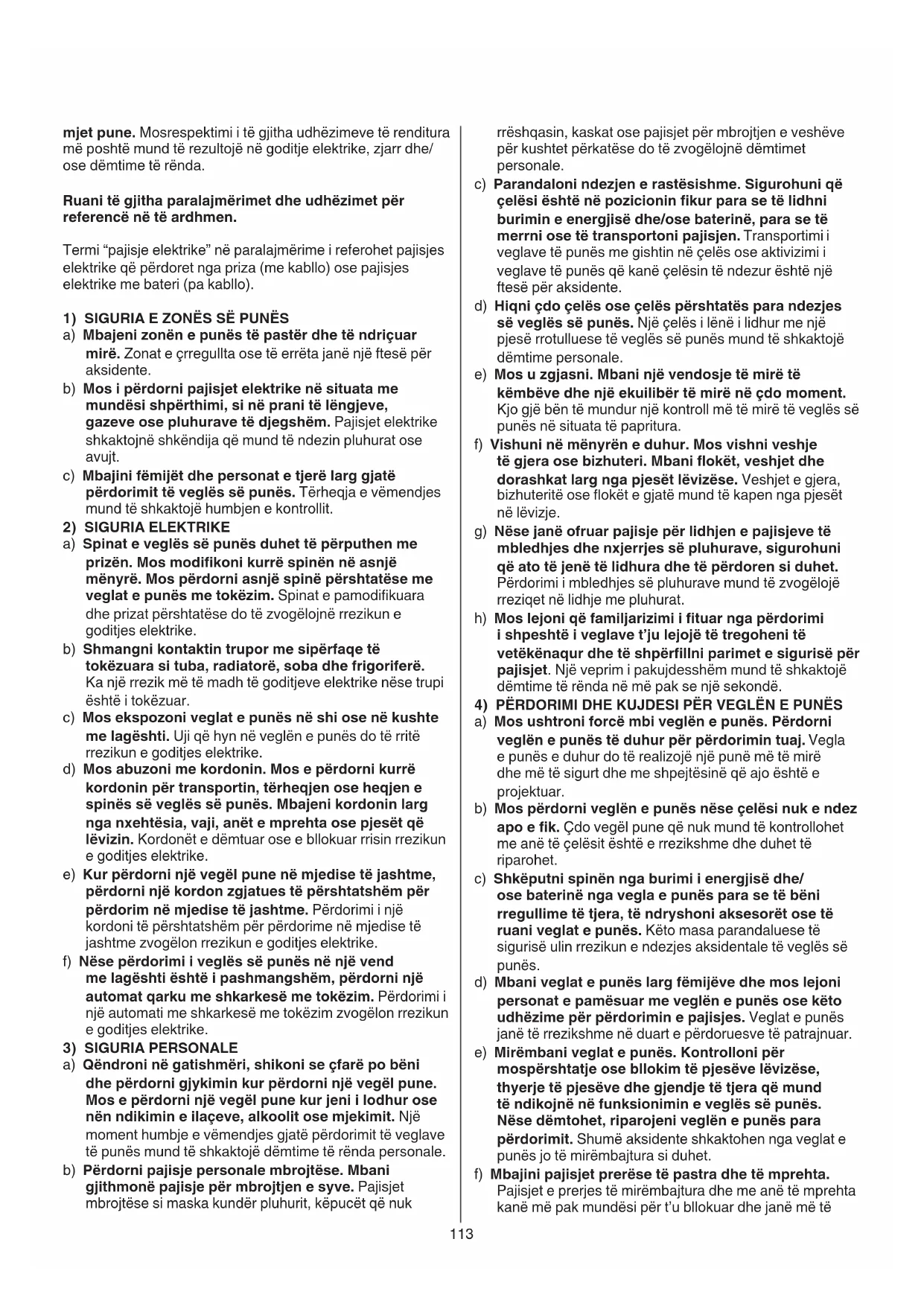 a) Qëndroni në gatishmëri, shikoni se çfarë po bëni dhe përdorni gjykimin kur përdorni një vegël pune. Mos e përdorni një vegël pune kur jeni i lodhur ose nën ndikimin e ilaçeve, alkoolit ose mjekimit. Një moment humbje e vëmendjes gjatë përdorimit të veglave të punës mund të shkaktojë dëmtime të rënda personale. b) Përdorni pajisje personale mbrojtëse. Mbani gjithmonë pajisje për mbrojtjen e syve. Pajisjet mbrojtëse si maska kundër pluhurit, këpucët që nuk114 me lëndët shtesë për kondicionimin e drurit; mbani një maskë për pluhurat dhe punoni me një pajisje për heqjen e pluhurave kur mund të lidhet