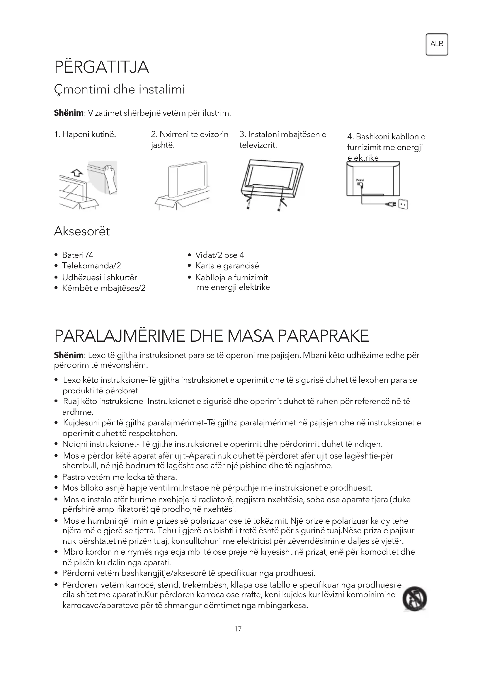 Mbulimi i kanalit DTV: 177.5MHz ~ 858MHz ATV: 47.25MHz ~ 865.25MHz Numri maksimal i programeve të ruajtura DTV: 10000 ATV: 200 Mjedis (vetëm zona klimatike tropikale) Temperatura e punës: 5 ˚C ~ 45 ˚C Lagështia e ajrit gjatë operacionit: 20% ~ 80% Temperatura e magazinimit: -15 ˚C ~ 50 ˚C Lagështia e ajrit gjatë ruajtjes: 10% ~ 90% Mjedis (vetëm për zona të moderuara klimatike) Temperatura e punës: 5 ˚C ~ 35 ˚C Lagështia e ajrit në punë: 20% ~ 80% Temperatura e magazinimit: -15 ˚C ~ 45 ˚C Lagështia e ajrit gjatë ruajtjes: 10% ~ 90% Shënim: Disa specifikime mund të ndryshojnë në rajone ose modele të ndryshme, për përdorim standard televiziv.30 ALB LICENCES Licensuar nën Dolby Laboratories. Dolby, Dolby Audio dhe Dolby Laboratories. Për një patentë DTS, shih http://patents.dts.com. Prodhuar nën licencën e DTS Licensing Limited. DTS, Symbol, DTS dhe Symbol janë marka të regjistruara dhe DTS Tru Surround është një markë tregtare e DTS Inc. © DTS Inc. Të gjitha të drejtat e rezervuara. Termet HDMI dhe HDMI Multimedia me definicion të lartë Interfejs, dhe HDMIIogo janë marka tregtare të regjistruara të HDMI Licensing LLC në SHBA dhe vendet tjera.31 BiH/CG PRIPREMA Rasklapanje i postavljanje Dodaci Napomena: Prikazi služe isključivo kao primjer.