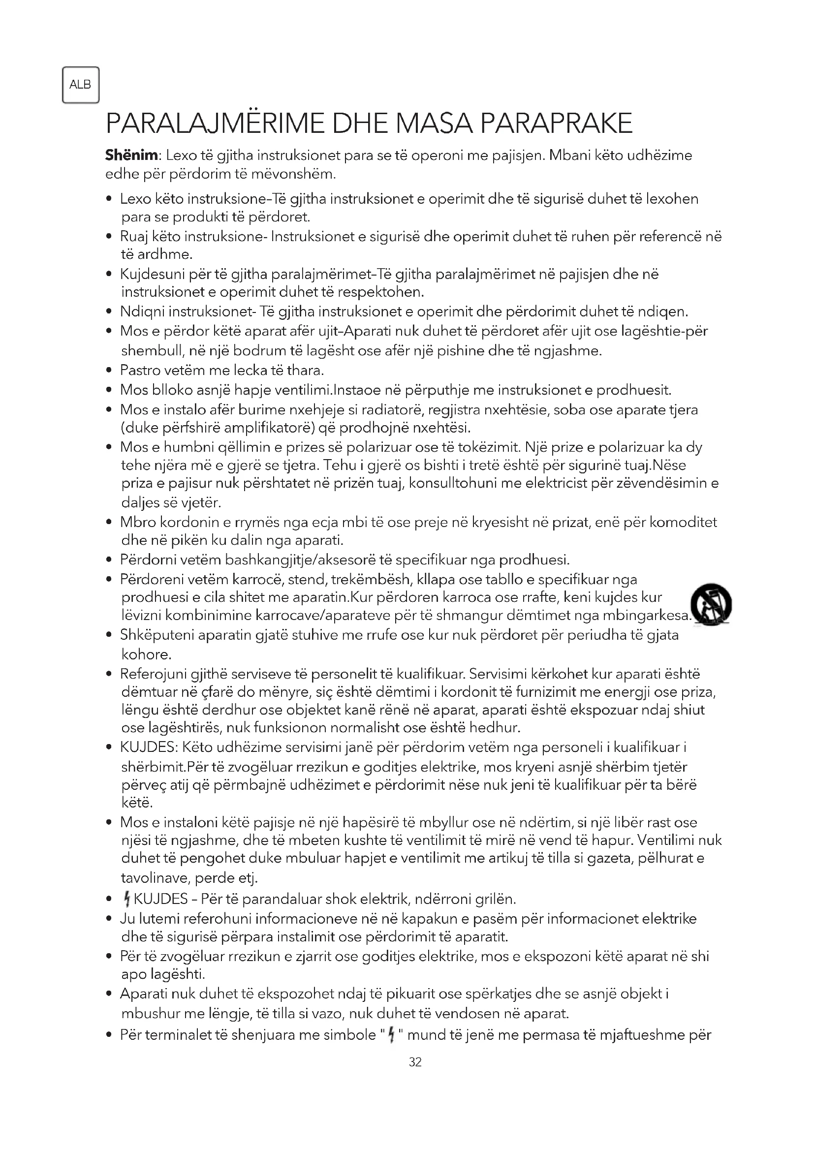 - Ruaj këto instruksione- Instruksionet e sigurisë dhe operimit duhet të ruhen për referencë në të ardhme.