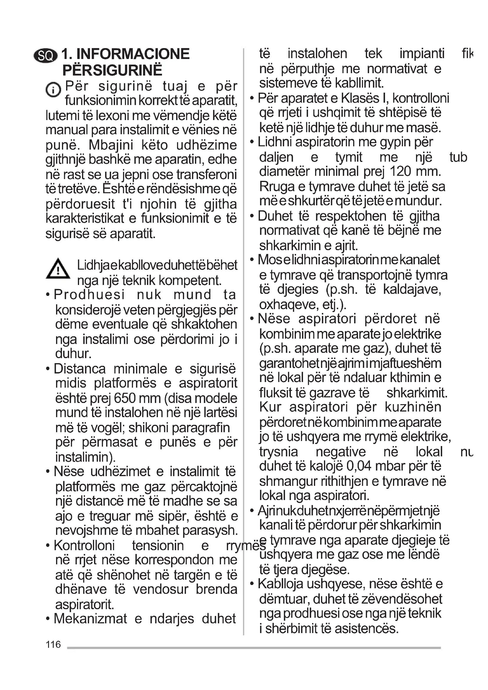 - Nëse aspiratori përdoret në kombinim me aparate jo elektrike (p.sh. aparate me gaz), duhet të garantohet një ajrim i mjaftueshëm në lokal për të ndaluar kthimin e uksittëgazravetë shkarkimit. Kur aspiratori për kuzhinën përdoret në kombinim me aparate jotëushqyeramerrymëelektrike, trysnia negative në lokal nuk duhet të kalojë 0,04 mbar për të shmangurrithithjenetymravenë lokal nga aspiratori.