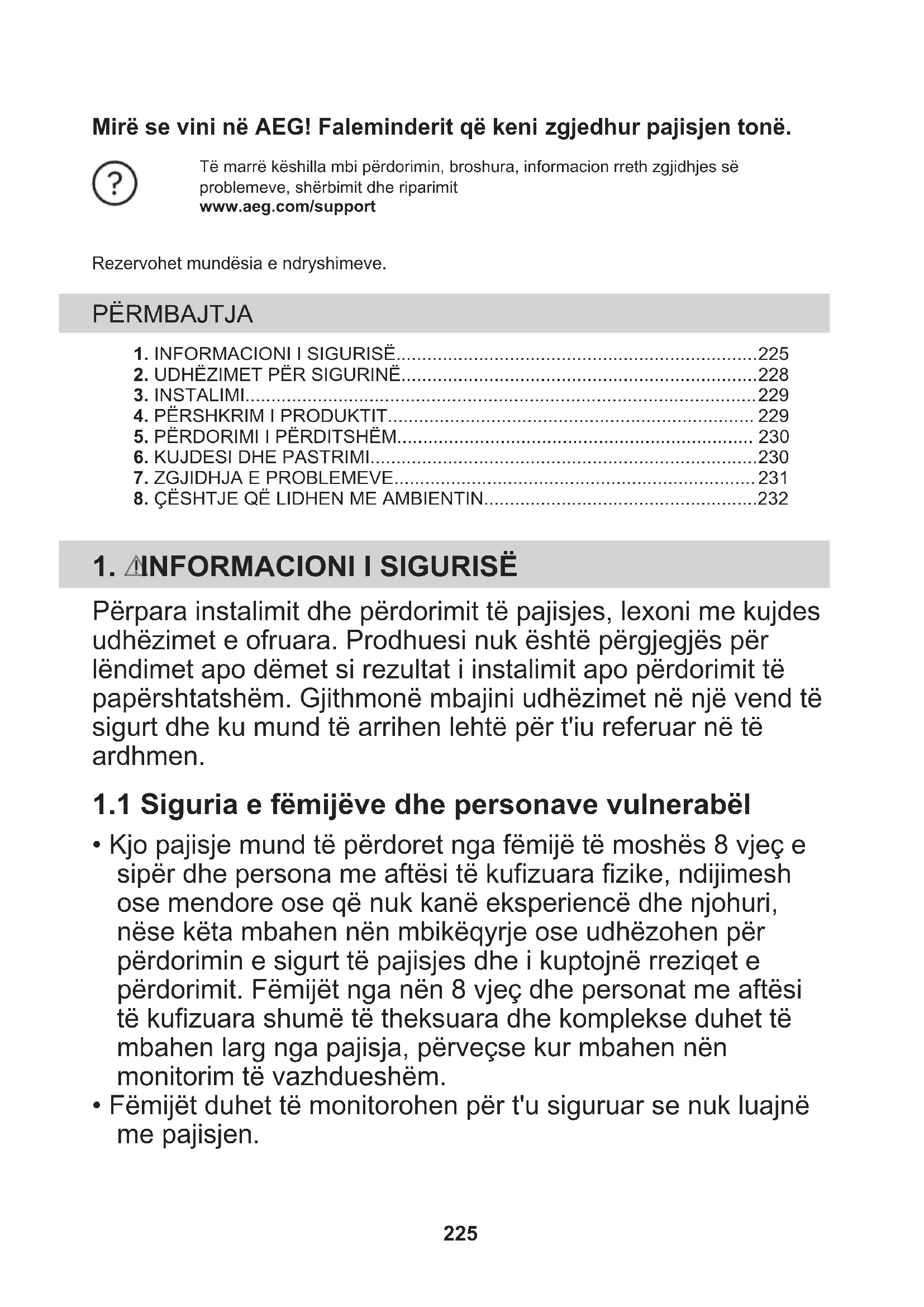 - Kjo pajisje mund të përdoret nga fëmijë të moshës 8 vjeç e sipër dhe persona me aftësi të kufizuara fizike, ndijimesh ose mendore ose që nuk kanë eksperiencë dhe njohuri, nëse këta mbahen nën mbikëqyrje ose udhëzohen për përdorimin e sigurt të pajisjes dhe i kuptojnë rreziqet e përdorimit. Fëmijët nga nën 8 vjeç dhe personat me aftësi të kufizuara shumë të theksuara dhe komplekse duhet të mbahen larg nga pajisja, përveçse kur mbahen nën monitorim të vazhdueshëm.
