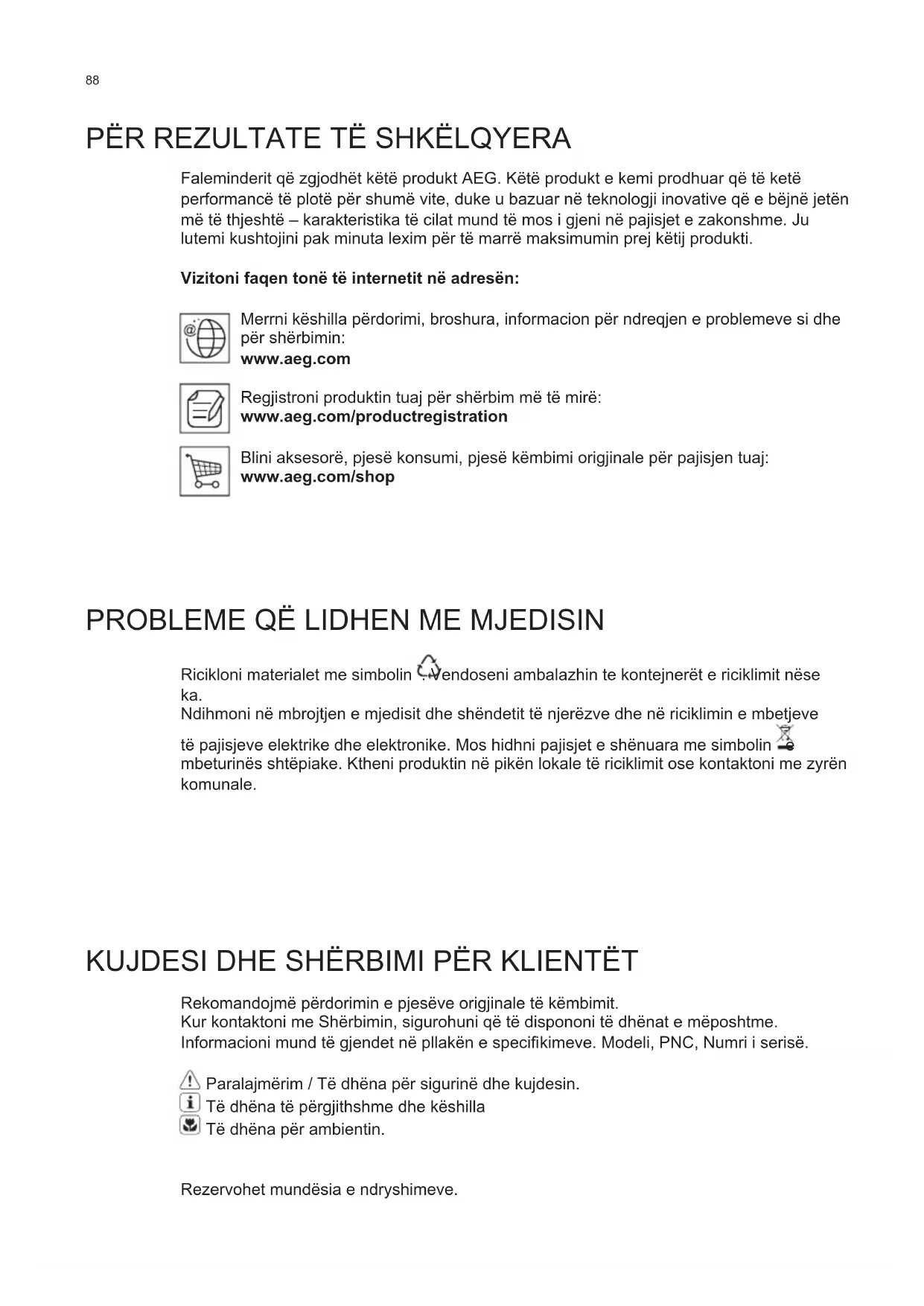 Faleminderit që zgjodhët këtë produkt AEG. Këtë produkt e kemi prodhuar që të ketë performancë të plotë për shumë vite, duke u bazuar në teknologji inovative që e bëjnë jetën më të thjeshtë – karakteristika të cilat mund të mos i gjeni në pajisjet e zakonshme. Ju lutemi kushtojini pak minuta lexim për të marrë maksimumin prej këtij produkti. Vizitoni faqen tonë të internetit në adresën: Merrni këshilla përdorimi, broshura, informacion për ndreqjen e problemeve si dhe për shërbimin: www.aeg.com Regjistroni produktin tuaj për shërbim më të mirë: www.aeg.com/productregistration Blini aksesorë, pjesë konsumi, pjesë këmbimi origjinale për pajisjen tuaj: www.aeg.com/shop