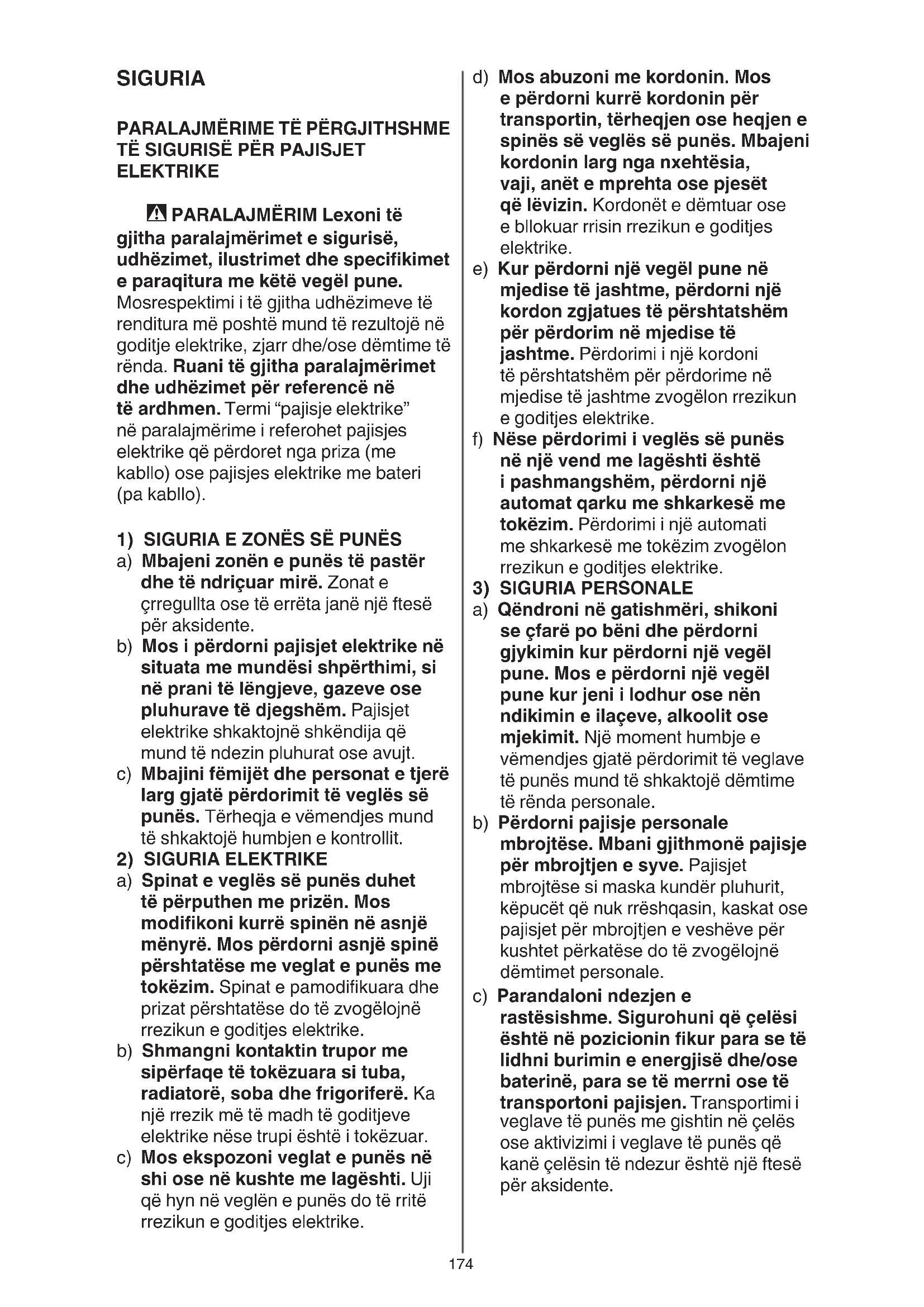 a) Spinat e veglës së punës duhet të përputhen me prizën. Mos modikoni kurrë spinën në asnjë mënyrë. Mos përdorni asnjë spinë përshtatëse me veglat e punës me tokëzim. Spinat e pamodikuara dhe prizat përshtatëse do të zvogëlojnë rrezikun e goditjes elektrike. b) Shmangni kontaktin trupor me sipërfaqe të tokëzuara si tuba, radiatorë, soba dhe frigoriferë. Ka një rrezik më të madh të goditjeve elektrike nëse trupi është i tokëzuar. c) Mos ekspozoni veglat e punës në shi ose në kushte me lagështi. Uji që hyn në veglën e punës do të rritë rrezikun e goditjes elektrike.175 të sigurisë ulin rrezikun e ndezjes aksidentale të veglës së punës. d) Mbani veglat e punës larg fëmijëve dhe mos lejoni personat e pamësuar me veglën e punës ose këto udhëzime për përdorimin e pajisjes. Veglat e punës janë të rrezikshme në duart e përdoruesve të patrajnuar. e) Mirëmbani veglat e punës. Kontrolloni për mospërshtatje ose bllokim të pjesëve lëvizëse, thyerje të pjesëve dhe gjendje të tjera që mund të ndikojnë në funksionimin e veglës së punës. Nëse dëmtohet, riparojeni veglën e punës para përdorimit. Shumë aksidente shkaktohen nga veglat e punës jo të mirëmbajtura si duhet. f) Mbajini pajisjet prerëse të pastra dhe të mprehta. Pajisjet e prerjes të mirëmbajtura dhe me anë të mprehta kanë më pak mundësi për t’u bllokuar dhe janë më të lehta për t’u kontrolluar. g) Përdorni veglat e punës, aksesorët dhe puntot, etj. në përputhje me këto udhëzime, duke marrë parasysh kushtet e punës dhe punën që do të kryhet. Përdorimi i veglave për përdorime të ndryshme nga ato të përcaktuara mund të shkaktojë rreziqe. h) Mbajini dorezat dhe sipërfaqet ku mbaheni të thata, të pastra dhe pa vajra ose graso. Dorezat dhe sipërfaqet ku mbaheni, kur janë të rrëshqitshme, nuk ju lejojnë ta menaxhoni dhe ta kontrolloni në mënyrë të sigurt pajisjen në situata të papritura.