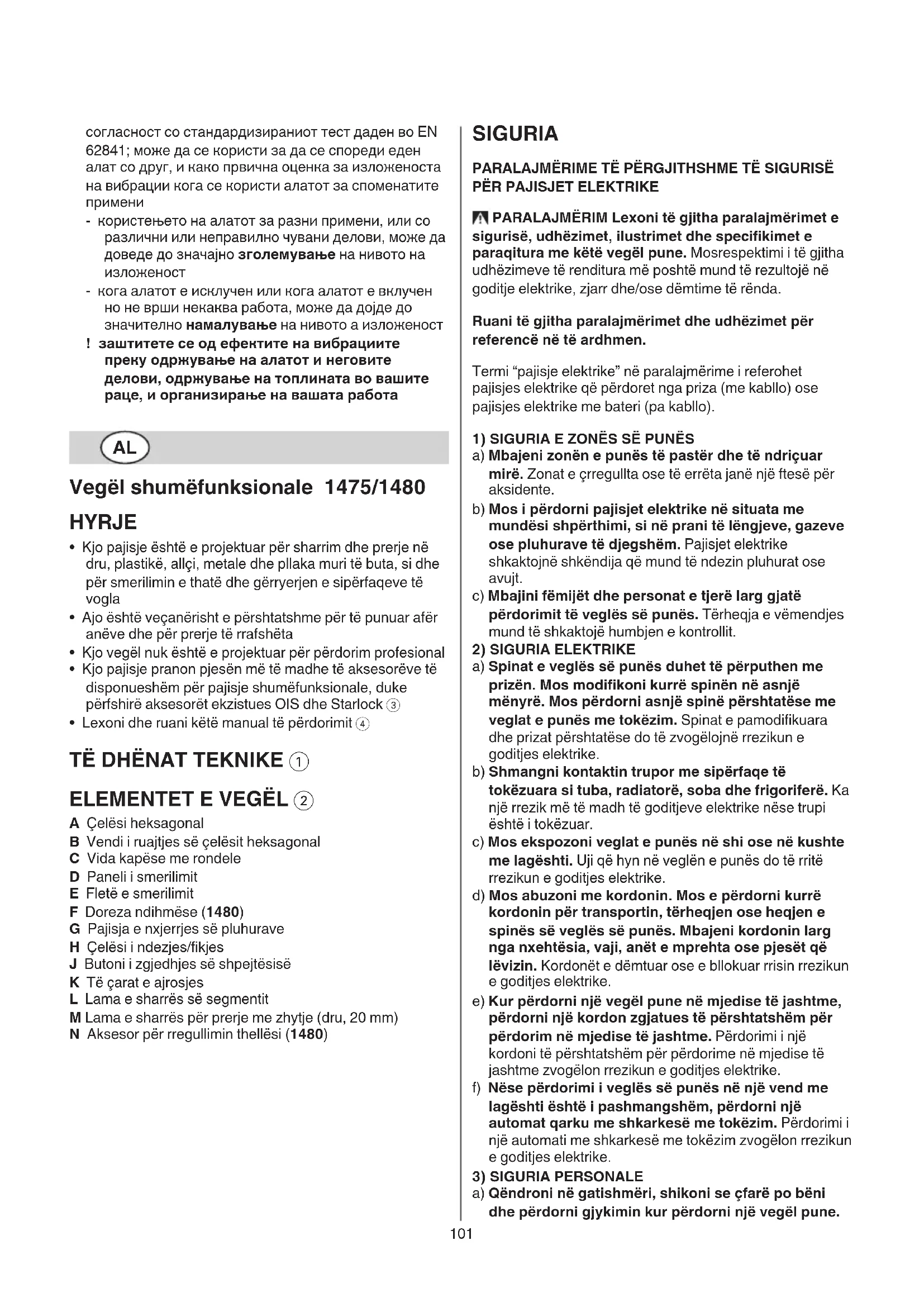 A Çelësi heksagonal B Vendi i ruajtjes së çelësit heksagonal C Vida kapëse me rondele D Paneli i smerilimit E Fletë e smerilimit F Doreza ndihmëse (1480) G Pajisja e nxjerrjes së pluhurave H Çelësi i ndezjes/fikjes J Butoni i zgjedhjes së shpejtësisë K Të çarat e ajrosjes L Lama e sharrës së segmentit M Lama e sharrës për prerje me zhytje (dru, 20 mm) N Aksesor për rregullimin thellësi (1480) SIGURIA PARALAJMËRIME TË PËRGJITHSHME TË SIGURISË