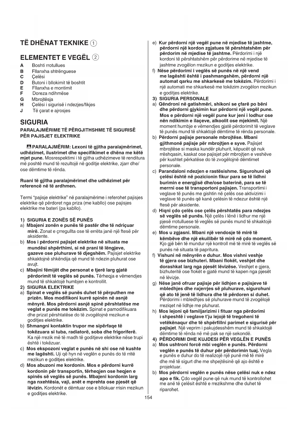 A Boshti rrotullues B Fllanxha shtrënguese C Çelësi D Butoni i bllokimit të boshtit E Fllanxha e montimit F Doreza ndihmëse G Mbrojtësja H Çelësi i sigurisë i ndezjes/kjes J Të çarat e ajrosjes SIGURIA PARALAJMËRIME TË PËRGJITHSHME TË SIGURISË