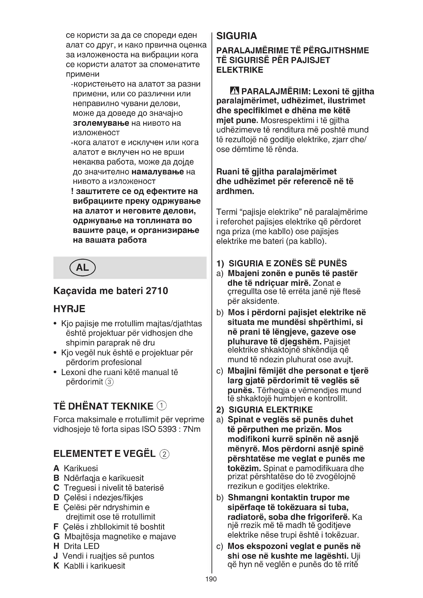 ELEKTRIKE - PARALAJMËRIM: Lexoni të gjitha paralajmërimet, udhëzimet, ilustrimet dhe specikimet e dhëna me këtë mjet pune. Mosrespektimi i të gjitha udhëzimeve të renditura më poshtë mund të rezultojë në goditje elektrike, zjarr dhe/ ose dëmtime të rënda. Ruani të gjitha paralajmërimet dhe udhëzimet për referencë në të ardhmen. Termi “pajisje elektrike” në paralajmërime i referohet pajisjes elektrike që përdoret nga priza (me kabllo) ose pajisjes elektrike me bateri (pa kabllo).