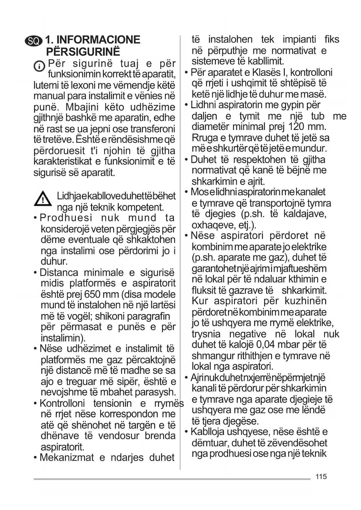 - Nëse aspiratori përdoret në kombinim me aparate jo elektrike (p.sh. aparate me gaz), duhet të garantohet një ajrim i mjaftueshëm në lokal për të ndaluar kthimin e uksittëgazravetë shkarkimit. Kur aspiratori për kuzhinën përdoret në kombinim me aparate jotëushqyeramerrymëelektrike, trysnia negative në lokal nuk duhet të kalojë 0,04 mbar për të shmangurrithithjenetymravenë lokal nga aspiratori.