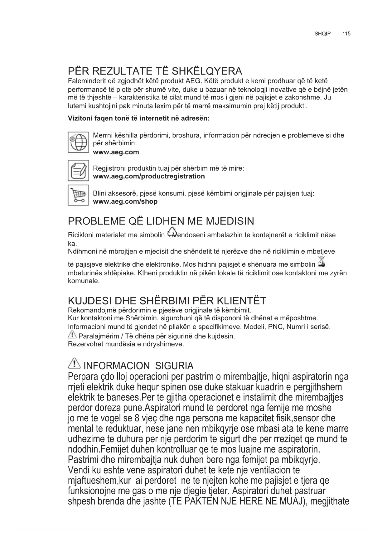 Ricikloni materialet me simbolin . Vendoseni ambalazhin te kontejnerët e riciklimit nëse ka. Ndihmoni në mbrojtjen e mjedisit dhe shëndetit të njerëzve dhe në riciklimin e mbetjeve të pajisjeve elektrike dhe elektronike. Mos hidhni pajisjet e shënuara me simbolin e mbeturinës shtëpiake. Ktheni produktin në pikën lokale të riciklimit ose kontaktoni me zyrën komunale. KUJDESI DHE SHËRBIMI PËR KLIENTËT Rekomandojmë përdorimin e pjesëve origjinale të këmbimit. Kur kontaktoni me Shërbimin, sigurohuni që të dispononi të dhënat e mëposhtme. Informacioni mund të gjendet në pllakën e specikimeve. Modeli, PNC, Numri i serisë. Paralajmërim / Të dhëna për sigurinë dhe kujdesin. Rezervohet mundësia e ndryshimeve. INFORMACION SIGURIA Perpara çdo lloj operacioni per pastrim o mirembajtje, hiqni aspiratorin nga rrjeti elektrik duke hequr spinen ose duke stakuar kuadrin e pergjithshem elektrik te baneses.Per te gjitha operacionet e instalimit dhe mirembajtjes perdor doreza pune.Aspiratori mund te perdoret nga femije me moshe jo me te vogel se 8 vjeç dhe nga persona me kapacitet sik,sensor dhe mental te reduktuar, nese jane nen mbikqyrje ose mbasi ata te kene marre udhezime te duhura per nje perdorim te sigurt dhe per rreziqet qe mund te ndodhin.Femijet duhen kontrolluar qe te mos luajne me aspiratorin. Pastrimi dhe mirembajtja nuk duhen bere nga femijet pa mbikqyrje. Vendi ku eshte vene aspiratori duhet te kete nje ventilacion te mjaftueshem,kur ai perdoret ne te njejten kohe me pajisjet e tjera qe funksionojne me gas o me nje djegie tjeter. Aspiratori duhet pastruar shpesh brenda dhe jashte (TE PAKTEN NJE HERE NE MUAJ), megjithate SQ UDHËZUES PËR PËRDORIMINwww.aeg.com