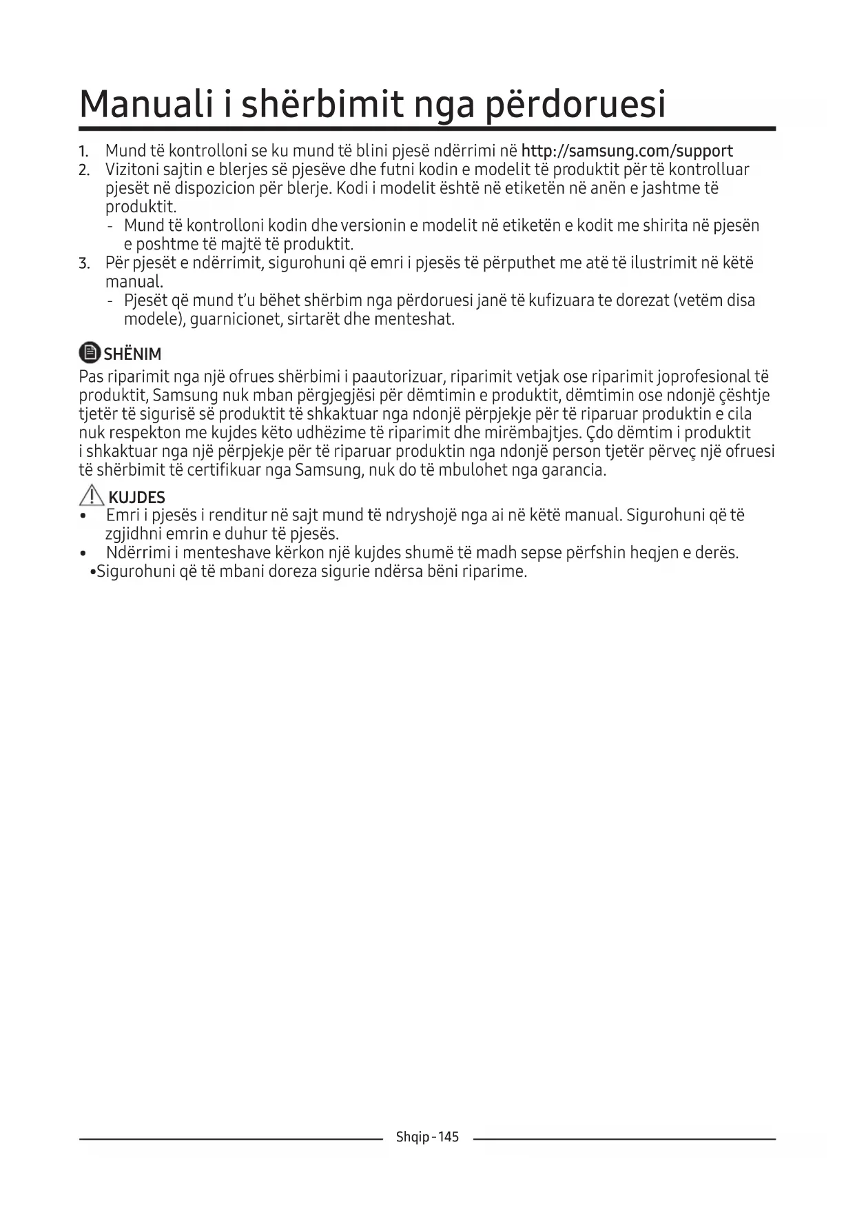 manual. ‐ Pjesët që mund t’u bëhet shërbim nga përdoruesi janë të kufizuara te dorezat (vetëm disa modele), guarnicionet, sirtarët dhe menteshat. SHËNIM Pas riparimit nga një ofrues shërbimi i paautorizuar, riparimit vetjak ose riparimit joprofesional të produktit, Samsung nuk mban përgjegjësi për dëmtimin e produktit, dëmtimin ose ndonjë çështje tjetër të sigurisë së produktit të shkaktuar nga ndonjë përpjekje për të riparuar produktin e cila nuk respekton me kujdes këto udhëzime të riparimit dhe mirëmbajtjes. Çdo dëmtim i produktit ishkaktuar nga një përpjekje për të riparuar produktin nga ndonjë person tjetër përveç një ofruesi të shërbimit të certifikuar nga Samsung, nuk do të mbulohet nga garancia. KUJDES