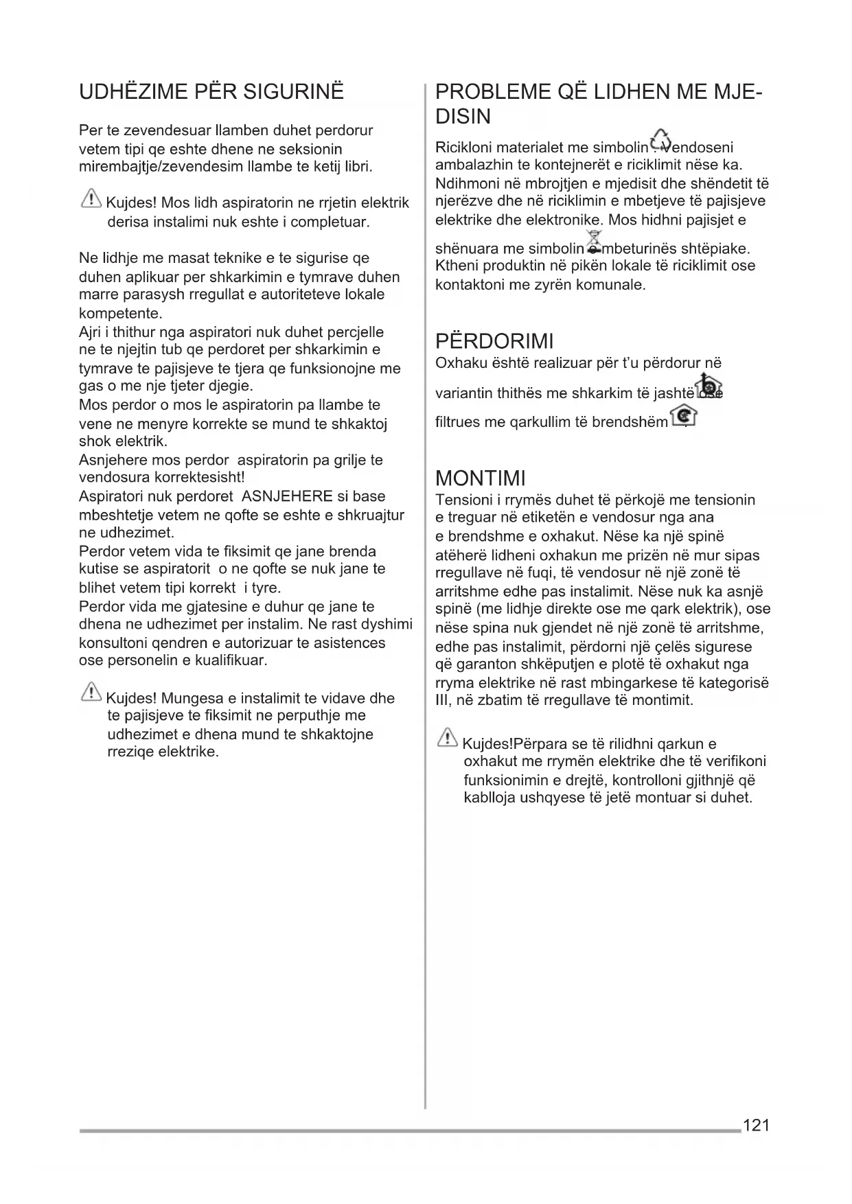 Per te zevendesuar llamben duhet perdorur vetem tipi qe eshte dhene ne seksionin mirembajtje/zevendesimllambeteketijlibri. Kujdes!Moslidhaspiratorinnerrjetinelektrik derisainstaliminukeshteicompletuar. Ne lidhje me masat teknike e te sigurise qe duhenaplikuarpershkarkiminetymraveduhen marreparasyshrregullateautoritetevelokale kompetente. Ajri i thithur nga aspiratori nuk duhet percjelle ne te njejtin tub qe perdoret per shkarkimin e tymravetepajisjevetetjeraqefunksionojneme gasomenjetjeterdjegie. Mos perdor o mos le aspiratorin pa llambe te venenemenyrekorrektesemundteshkaktoj shokelektrik. Asnjehere mos perdor aspiratorin pa grilje te vendosurakorrektesisht! AspiratorinukperdoretASNJEHEREsibase mbeshtetje vetem ne qofte se eshte e shkruajtur neudhezimet. Perdorvetemvidateksimitqejanebrenda kutise se aspiratorit o ne qofte se nuk jane te blihetvetemtipikorrektityre. Perdor vida me gjatesine e duhur qe jane te dhenaneudhezimetperinstalim.Nerastdyshimi konsultoni qendren e autorizuar te asistences osepersonelinekualikuar. Kujdes!Mungesaeinstalimittevidavedhe te pajisjeve te fiksimit ne perputhje me udhezimet e dhena mund te shkaktojne rreziqeelektrike. PROBLEMEQËLIDHENMEMJE- DISIN Ricikloni materialet me simbolin .Vendoseni ambalazhintekontejnerëtericiklimitnëseka. Ndihmoni në mbrojtjen e mjedisit dhe shëndetit të njerëzve dhe në riciklimin e mbetjeve të pajisjeve elektrikedheelektronike.Moshidhnipajisjete shënuara me simbolin embeturinësshtëpiake. Ktheni produktin në pikën lokale të riciklimit ose kontaktonimezyrënkomunale. PËRDORIMI Oxhaku është realizuar për t’u përdorur në variantin thithës me shkarkim të jashtë ose ltruesmeqarkullimtëbrendshëm . MONTIMI Tensioniirrymësduhettëpërkojëmetensionin e treguar në etiketën e vendosur nga ana ebrendshmeeoxhakut.Nësekanjëspinë atëherë lidheni oxhakun me prizën në mur sipas rregullavenëfuqi,tëvendosurnënjëzonëtë arritshmeedhepasinstalimit.Nësenukkaasnjë spinë(melidhjedirekteosemeqarkelektrik),ose nësespinanukgjendetnënjëzonëtëarritshme, edhepasinstalimit,përdorninjëçelëssigurese që garanton shkëputjen e plotë të oxhakut nga rrymaelektrikenërastmbingarkesetëkategorisë III,nëzbatimtërregullavetëmontimit. Kujdes!Përparasetërilidhniqarkune oxhakutmerrymënelektrikedhetëverifikoni funksioniminedrejtë,kontrollonigjithnjëqë kabllojaushqyesetëjetëmontuarsiduhet.122 Largësia minimale midis sipërfaqes mbështetëse të eneve mbi pllakën e gatimit dhe pjesës më të poshtme të oxhakut thithës duhet të jetë jo më pak se 50cm në rastin e kuzhinave elekrike dhe jo më pak se 65cm në rastin e kuzhinave me gaz apotëpërziera.Nëseudhëzimeteinstalimittë pllakave të gatimit me gaz përcaktojnë një largësi mëtëmadhe,duhettëmbahetgjithnjëparasysh. MIRËMBAJTJA Kujdes! Përpara çdo veprimi pastrimi ose mirëmbajtjeje,shkëputenioxhakunnga rrymaelektrikedukehequrspinënoseduke ulursiguresësepërgjithshmetëbanesës. Oxhaku duhet të pastrohet herë pas here (të paktënmetënjëjtënkohëzgjatjeqëkryehet mirëmbajtjaeltravetëyndyrës),singabrenda ashtuedhengajashtë.Përpastriminpërdorninjë leckëtënjomëmeilaçlarëstëlëngëtjogërryes. Mospërdorniprodukteqëpërmbajnëgërryese. MOSPËRDORNIALKOL! Kujdes! Mosrespektimi i rregullave të pastërtisë së pajisjes dhe të zëvendësimit të filtravepërbënrrezikzjarri.Bënikujdesqë tëzbatoniudhëzimetedhëna.Shoqërianuk mban përgjegjësi për dëme të mundshme tekmotorri,përzjarretëshkaktuaranga mosmirëmbajtja apo nga moszbatimi i vërejtjevetëmësipërme. Filtri antiyndyrë-Filtriantiyndyrëmetalikduhet të pastrohet një herë në muaj me detergjentë jogërryes,medorëosememakinëlarëseme temperaturëtëulëtdhemecikëltëshkurtër.Kur lahetnëmakinëlarëse,ltriantiyndyrëmetalik mundtëçngjyroset,porkarakteristikatetijtë ltrimitnukndryshojnëaspak. Type 20 LONG LIFE – Filtër prej karboni aktiv që mund të lahet Filtri prej karboni mund të lahet çdo dy muaj me ujë të ngrohtë dhe detergjentë të përshtatshëm ose në makinë larëse në 65°C (në rastin kur lahet në makinë larëse përdor ciklin e plotë të larjes pa enëbrenda). Hiqeniujinetepërtpaedëmtuarltrin,mëpas hiqenidyshekunevogëltëvendosurnëbrendësi të shasisë prej plastike dhe vendoseni në furrë për 10minutanë100˚Cpërtatharëpërfundimisht. Zëvendësojenidyshekunevogëlçdo3vjetdhesa herëqëleckatëjetëdëmtuar. Type 15 - Filtër prej karboni aktiv që NUK lahet Bllokimiiltrittëkarbonitvërehetpasnjëpërdorimi pak a shumë të gjatë sipas llojit të kuzhinës dhe rregullsisë së pastrimit të ltrit të yndyrës. Sidoqoftë është e nevojshme të zëvendësohet të paktënçdokatërmuaj. NUKmundtëlahetdhetërivendoset.
