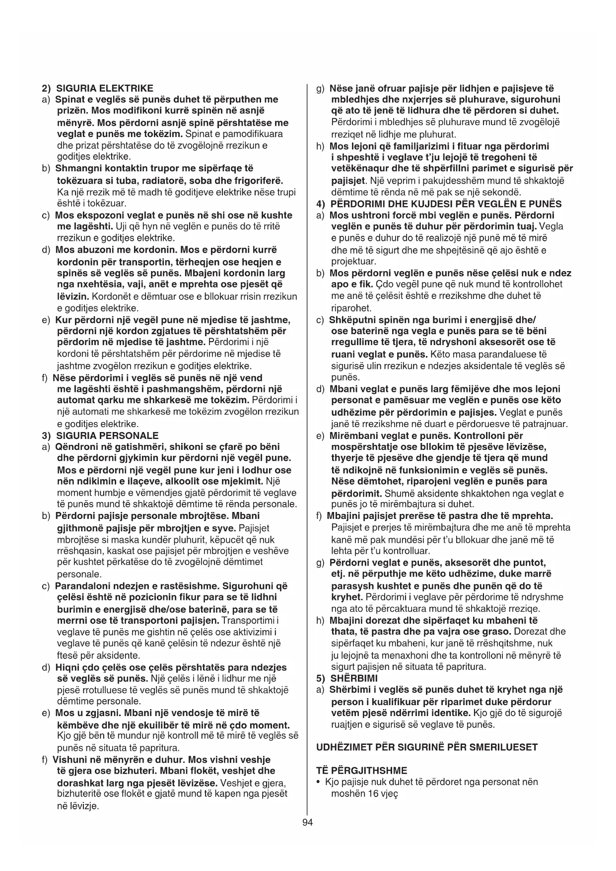 a) Qëndroni në gatishmëri, shikoni se çfarë po bëni dhe përdorni gjykimin kur përdorni një vegël pune. Mos e përdorni një vegël pune kur jeni i lodhur ose nën ndikimin e ilaçeve, alkoolit ose mjekimit. Një moment humbje e vëmendjes gjatë përdorimit të veglave të punës mund të shkaktojë dëmtime të rënda personale. b) Përdorni pajisje personale mbrojtëse. Mbani gjithmonë pajisje për mbrojtjen e syve. Pajisjet mbrojtëse si maska kundër pluhurit, këpucët që nuk rrëshqasin, kaskat ose pajisjet për mbrojtjen e veshëve për kushtet përkatëse do të zvogëlojnë dëmtimet personale. c) Parandaloni ndezjen e rastësishme. Sigurohuni që çelësi është në pozicionin kur para se të lidhni burimin e energjisë dhe/ose baterinë, para se të merrni ose të transportoni pajisjen. Transportimi i veglave të punës me gishtin në çelës ose aktivizimi i veglave të punës që kanë çelësin të ndezur është një ftesë për aksidente. d) Hiqni çdo çelës ose çelës përshtatës para ndezjes së veglës së punës. Një çelës i lënë i lidhur me një pjesë rrotulluese të veglës së punës mund të shkaktojë dëmtime personale. e) Mos u zgjasni. Mbani një vendosje të mirë të këmbëve dhe një ekuilibër të mirë në çdo moment. Kjo gjë bën të mundur një kontroll më të mirë të veglës së punës në situata të papritura. f) Vishuni në mënyrën e duhur. Mos vishni veshje të gjera ose bizhuteri. Mbani okët, veshjet dhe dorashkat larg nga pjesët lëvizëse. Veshjet e gjera, bizhuteritë ose okët e gjatë mund të kapen nga pjesët në lëvizje.95 PËRDORIMI