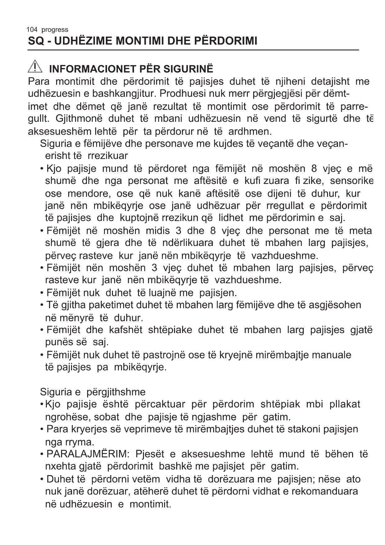 - Nuk duhet të përdorni pluhurthithës me avull, spërkatës të ujit, mjetet e ashpra gërryese pastruese ose mjetet metalike gërryese të ashpra për pastrimin e sipërfaqes së pajisjes. Duhet të shfrytëzoni vetëm detergjente natyrore.106 progress
