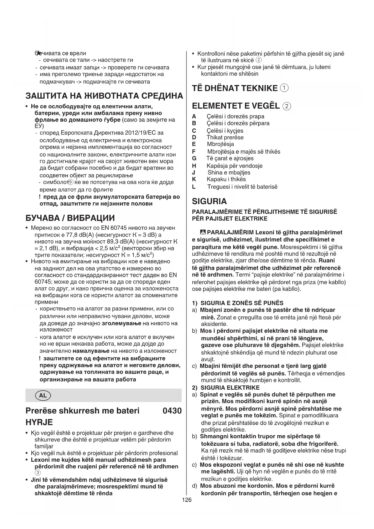 A Çelësi i dorezës prapa B Çelësi i dorezës përpara C Çelësi i kyçjes D Thikat prerëse E Mbrojtësja F Mbrojtësja e majës së thikës G Të çarat e ajrosjes H Kapësja për vendosje J Shina e mbajtjes K Kapaku i thikës L Treguesi i nivelit të baterisë SIGURIA PARALAJMËRIME TË PËRGJITHSHME TË SIGURISË