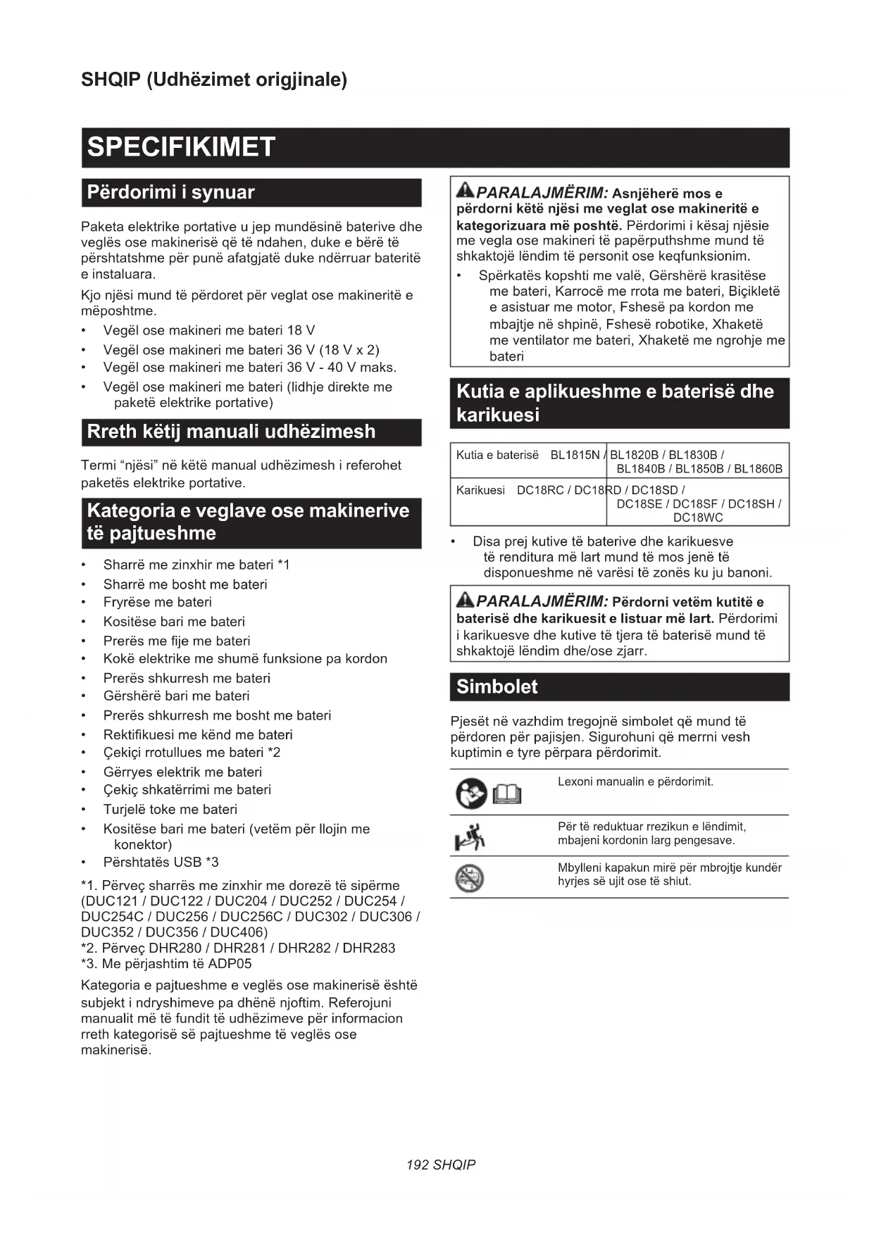 - Vegëlosemakinerimebateri(lidhjedirekteme paketëelektrikeportative) Rreth këtij manuali udhëzimesh Termi“njësi”nëkëtëmanualudhëzimeshireferohet paketëselektrikeportative. Kategoria e veglave ose makinerive të pajtueshme