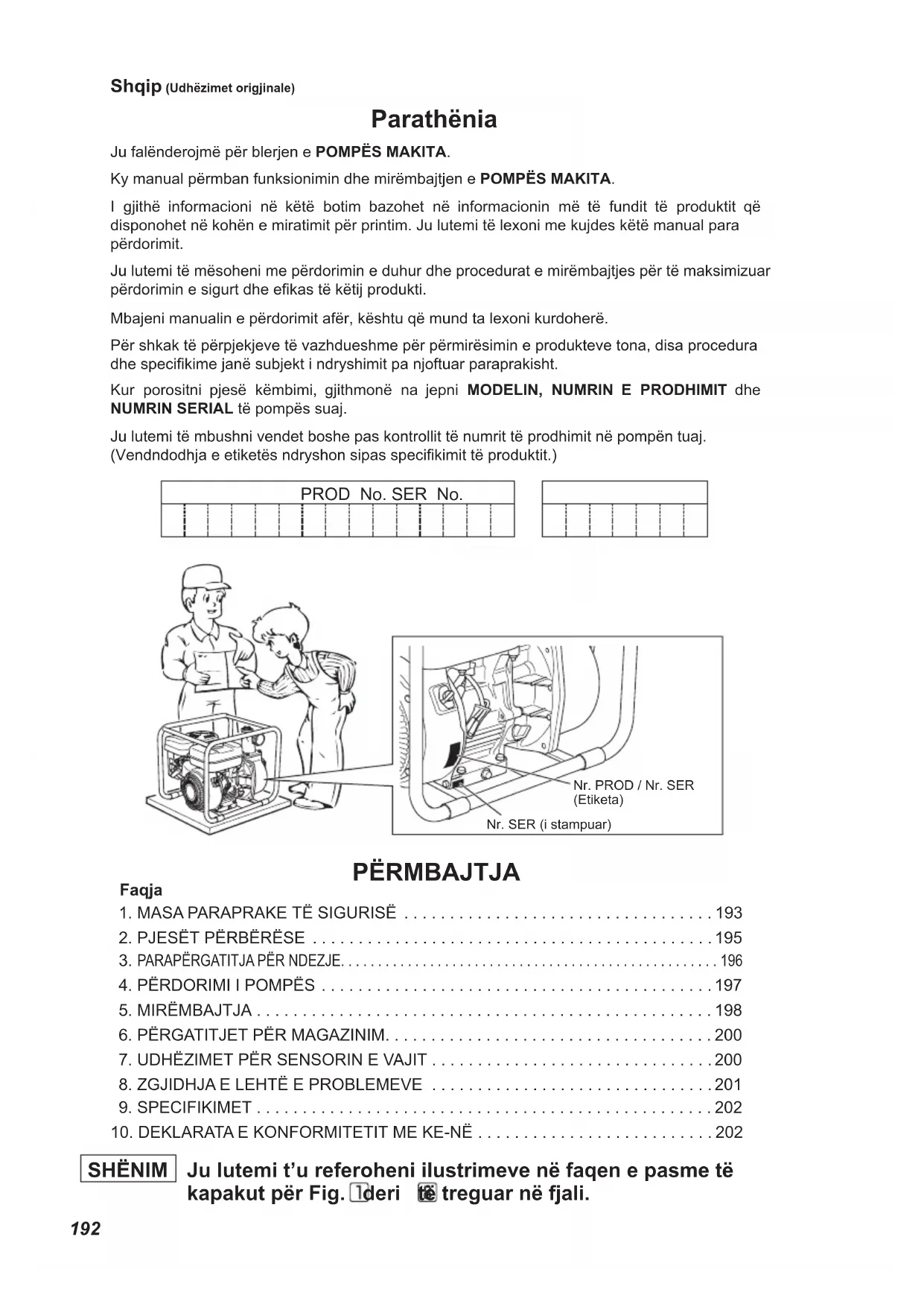 Ime znamke Izmerjena raven zvočnega hrupa Zagotovljena raven zvočnega hrupa EW2050H 100 dB(A) 101 dB(A) EW3050H 103 dB(A) 103 dB(A) EW2051H 101 dB(A) 103 dB(A) EW3051H 104 dB(A) 105 dB(A) Ni nujno, da ti nivoji hrupa zagotavljajo varen nivo za delo, vendar bo uporabnik s temi informacijami lahko bolje ocenil nevarnost in tveganja. Opomba: Nivo hrupa se spremeni s specikacijami. Specikacije se lahko spremenijo brez vnaprejšnjega obvestila.192 Parathënia Ju falënderojmë për blerjen e POMPËS MAKITA.Ky manual përmban funksionimin dhe mirëmbajtjen e POMPËS MAKITA. I gjithë informacioni në këtë botim bazohet në informacionin më të fundit të produktit që disponohet në kohën e miratimit për printim. Ju lutemi të lexoni me kujdes këtë manual para përdorimit.Ju lutemi të mësoheni me përdorimin e duhur dhe procedurat e mirëmbajtjes për të maksimizuar përdorimin e sigurt dhe ekas të këtij produkti.Mbajeni manualin e përdorimit afër, kështu që mund ta lexoni kurdoherë.Për shkak të përpjekjeve të vazhdueshme për përmirësimin e produkteve tona, disa procedura dhe specikime janë subjekt i ndryshimit pa njoftuar paraprakisht. Kur porositni pjesë këmbimi, gjithmonë na jepni MODELIN, NUMRIN E PRODHIMIT dhe NUMRIN SERIAL të pompës suaj.Ju lutemi të mbushni vendet boshe pas kontrollit të numrit të prodhimit në pompën tuaj. (Vendndodhja e etiketës ndryshon sipas specikimit të produktit.) PROD No. SER No. Nr. PROD / Nr. SER(Etiketa)Nr. SER (i stampuar) Ju lutemi t’u referoheni ilustrimeve në faqen e pasme të kapakut për Fig. deri të treguar në fjali. SHËNIM PËRMBAJTJA Faqja