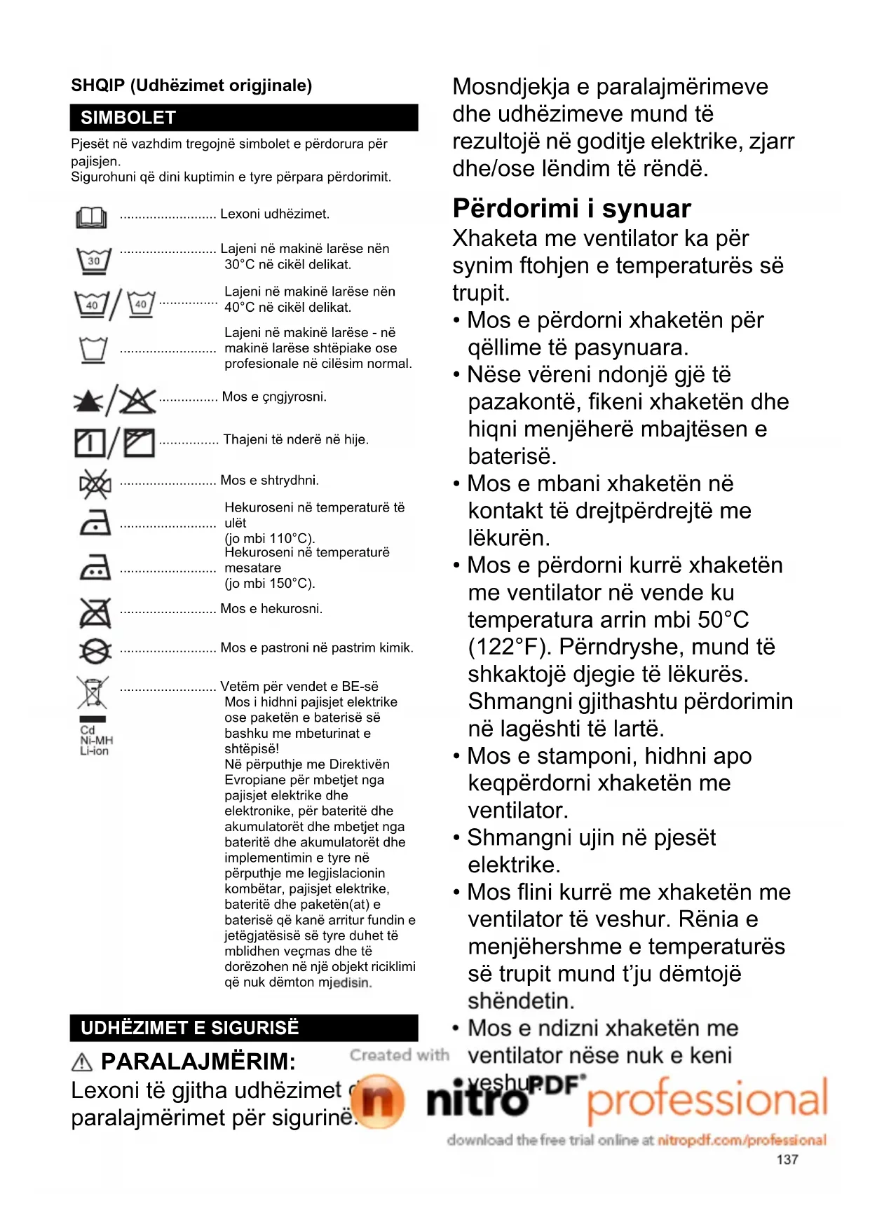 - Mos e ndizni xhaketën me ventilator nëse nuk e keni veshur. SIMBOLET .......................... Lexoni udhëzimet. .......................... Lajeni në makinë larëse nën 30°C në cikël delikat.
