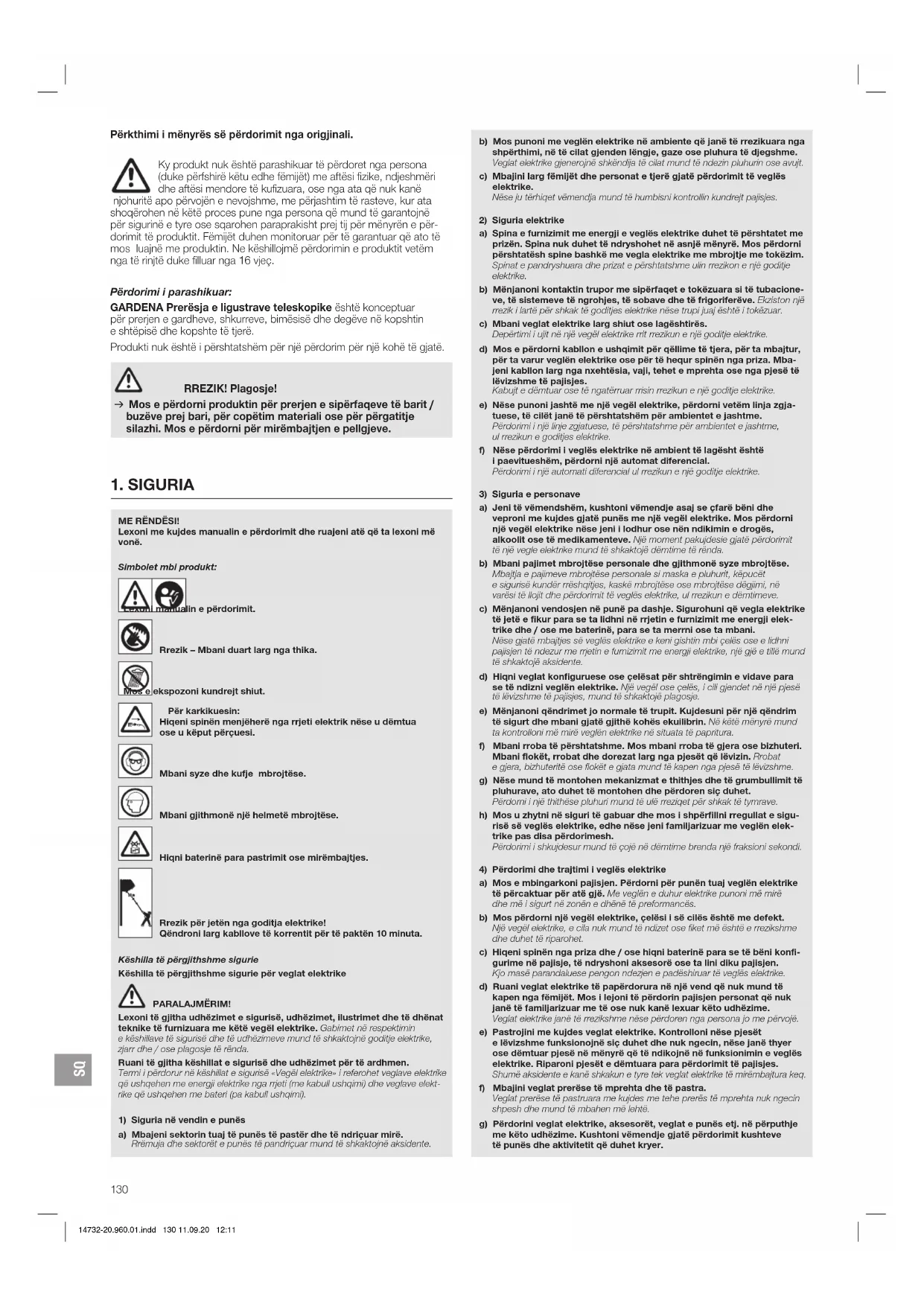 Përkthimi i mënyrës së përdorimit nga origjinali. Ky produkt nuk është parashikuar të përdoret nga persona (duke përfshirë këtu edhe fëmijët) me aftësi fizike, ndjeshmëri dhe aftësi mendore të kufizuara, ose nga ata që nuk kanë njohuritë apo përvojën e nevojshme, me përjashtim të rasteve, kur ata shoqërohen në këtë proces pune nga persona që mund të garantojnë për sigurinë e tyre ose sqarohen paraprakisht prej tij për mënyrën e për- dorimit të produktit. Fëmijët duhen monitoruar për të garantuar që ato të mos luajnë me produktin. Ne këshillojmë përdorimin e produktit vetëm nga të rinjtë duke filluar nga 16 vjeç. Përdorimi i parashikuar: GARDENA Prerësja e ligustrave teleskopike është konceptuar për prerjen e gardheve, shkurreve, bimësisë dhe degëve në kopshtin eshtëpisë dhe kopshte të tjerë. Produkti nuk është i përshtatshëm për një përdorim për një kohë të gjatë. RREZIK! Plagosje! v Mos e përdorni produktin për prerjen e sipërfaqeve të barit / buzëve prej bari, për copëtim materiali ose për përgatitje silazhi. Mos e përdorni për mirëmbajtjen e pellgjeve. 14732-20.960.01.indd 130 11.09.20 12:11SQ