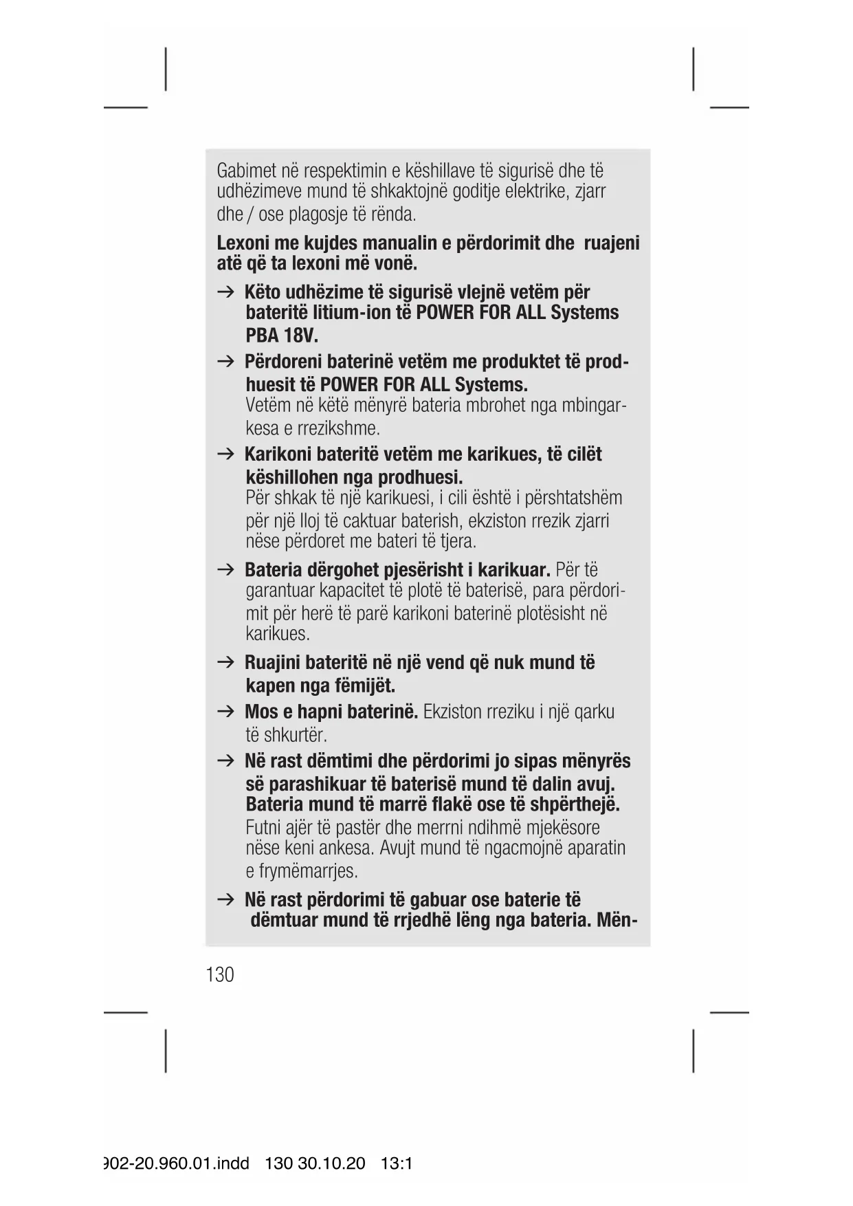 14902-20.960.01.indd 129 30.10.20 13:19Gabimet në respektimin e këshillave të sigurisë dhe të udhëzimeve mund të shkaktojnë goditje elektrike, zjarr dhe / ose plagosje të rënda. Lexoni me kujdes manualin e përdorimit dhe ruajeni atë që ta lexoni më vonë. v Këto udhëzime të sigurisë vlejnë vetëm për bateritë litium-ion të POWER FOR ALL Systems PBA 18V. v Përdoreni baterinë vetëm me produktet të prod- huesit të POWER FOR ALL Systems. Vetëm në këtë mënyrë bateria mbrohet nga mbingar- kesa e rrezikshme. v Karikoni bateritë vetëm me karikues, të cilët këshillohen nga prodhuesi. Për shkak të një karikuesi, i cili është i përshtatshëm për një lloj të caktuar baterish, ekziston rrezik zjarri nëse përdoret me bateri të tjera. v Bateria dërgohet pjesërisht i karikuar. Për të garantuar kapacitet të plotë të baterisë, para përdori- mit për herë të parë karikoni baterinë plotësisht në karikues. v Ruajini bateritë në një vend që nuk mund të kapen nga fëmijët. v Mos e hapni baterinë. Ekziston rreziku i një qarku të shkurtër. v Në rast dëmtimi dhe përdorimi jo sipas mënyrës së parashikuar të baterisë mund të dalin avuj. Bateria mund të marrë flakë ose të shpërthejë. Futni ajër të pastër dhe merrni ndihmë mjekësore nëse keni ankesa. Avujt mund të ngacmojnë aparatin e frymëmarrjes. v Në rast përdorimi të gabuar ose baterie të dëmtuar mund të rrjedhë lëng nga bateria. Mën-