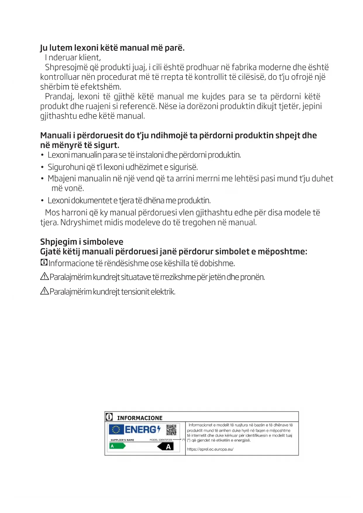 - Lexoni dokumentet e tjera të dhëna me produktin. Mos harroni që ky manual përdoruesi vlen gjithashtu edhe për disa modele të tjera. Ndryshimet midis modeleve do të tregohen në manual. Shpjegim i simboleve Gjatë këtij manuali përdoruesi janë përdorur simbolet e mëposhtme: CInformacione të rëndësishme ose këshilla të dobishme. AParalajmërim kundrejt situatave të rrezikshme për jetën dhe pronën. BParalajmërim kundrejt tensionit elektrik. INFORMACIONE