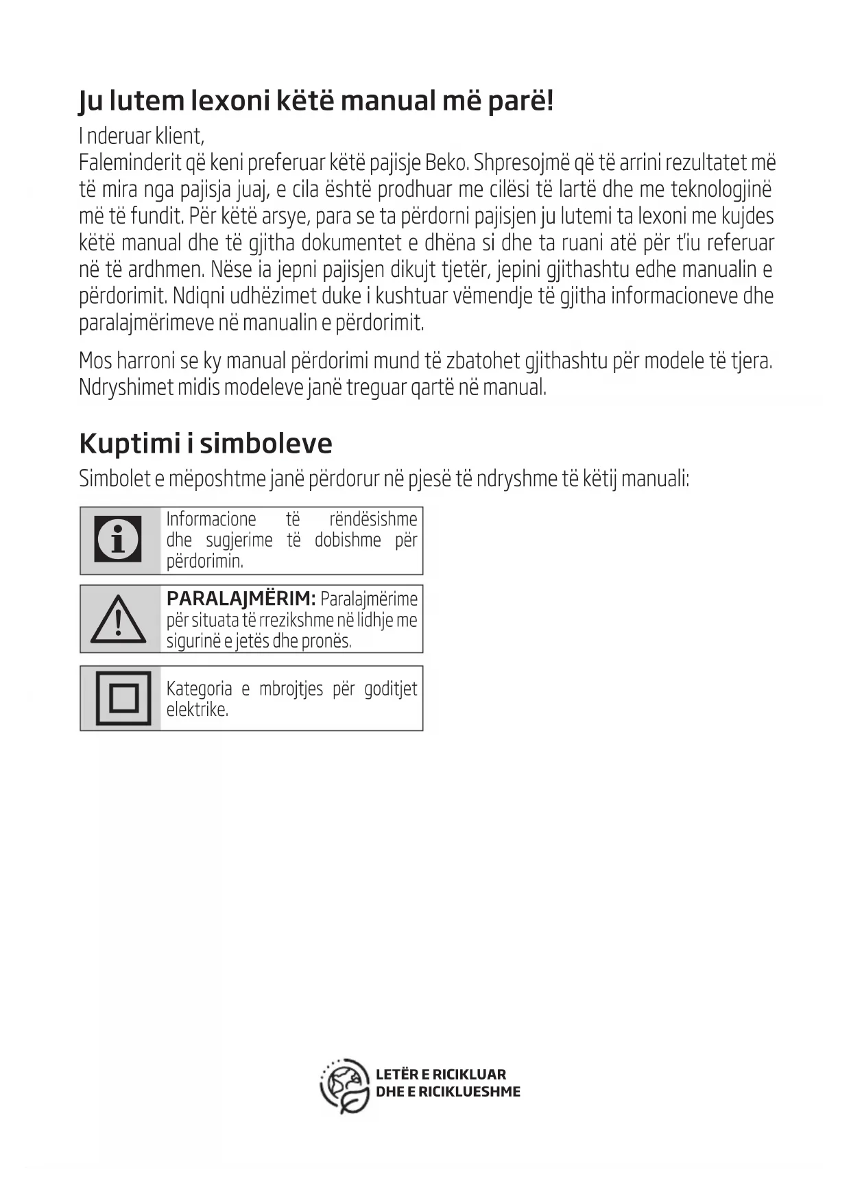 1. Otvorite poklopac HEPA filtra koji je na vašem uređaju i uklonite HEPA filtar povlačenjem za njegovu ručku.2. Otresite izlazni HEPA filtar da biste s njega uklonili prašinu. Zatim ga možete oprati držeći čistu stranu pod mlazom hladne vode.3. Ako operete HEPA filtar, osušite ga na sobnoj temperaturi (tijekom minimalno 24 sata). Nemojte ga koristiti prije nego se uvjerite da je potpuno suh.Ju lutem lexoni këtë manual më parë! I nderuar klient, Faleminderit që keni preferuar këtë pajisje Beko. Shpresojmë që të arrini rezultatet më të mira nga pajisja juaj, e cila është prodhuar me cilësi të lartë dhe me teknologjinë më të fundit. Për këtë arsye, para se ta përdorni pajisjen ju lutemi ta lexoni me kujdes këtë manual dhe të gjitha dokumentet e dhëna si dhe ta ruani atë për t'iu referuar në të ardhmen. Nëse ia jepni pajisjen dikujt tjetër, jepini gjithashtu edhe manualin e përdorimit. Ndiqni udhëzimet duke i kushtuar vëmendje të gjitha informacioneve dhe paralajmërimeve në manualin e përdorimit. Mos harroni se ky manual përdorimi mund të zbatohet gjithashtu për modele të tjera. Ndryshimet midis modeleve janë treguar qartë në manual. Kuptimi i simboleve Simbolet e mëposhtme janë përdorur në pjesë të ndryshme të këtij manuali: