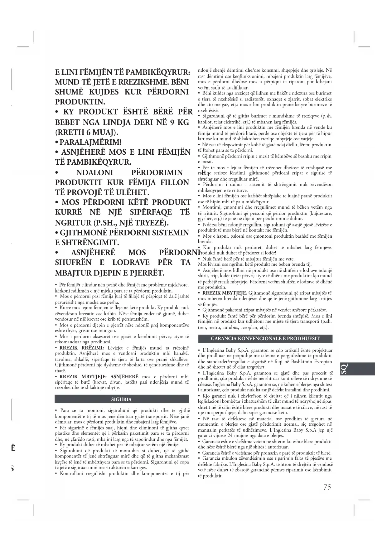 - Në rast të defekteve në material ose prodhim të gjetura në momentin e blerjes ose gjatë përdorimit normal, siç tregohet në manualin përkatës të udhëzimeve, L’Inglesina Baby S.p.A jep një garanci vijuese 24-mujore nga data e blerjes.