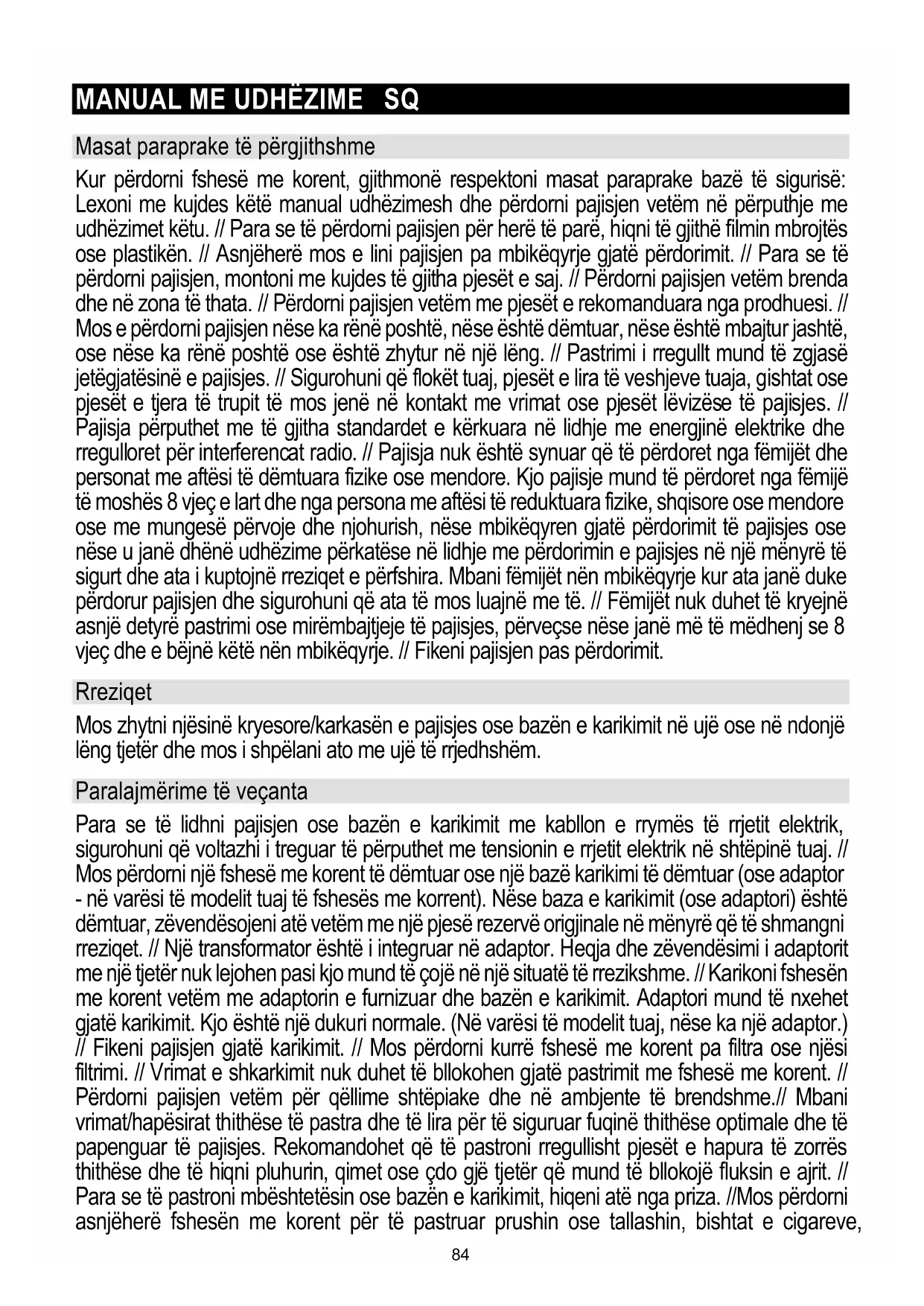 Masat paraprake të përgjithshme Kur përdorni fshesë me korent, gjithmonë respektoni masat paraprake bazë të sigurisë: Lexoni me kujdes këtë manual udhëzimesh dhe përdorni pajisjen vetëm në përputhje me udhëzimet këtu. // Para se të përdorni pajisjen për herë të parë, hiqni të gjithë filmin mbrojtës ose plastikën. // Asnjëherë mos e lini pajisjen pa mbikëqyrje gjatë përdorimit. // Para se të përdorni pajisjen, montoni me kujdes të gjitha pjesët e saj. // Përdorni pajisjen vetëm brenda dhe në zona të thata. // Përdorni pajisjen vetëm me pjesët e rekomanduara nga prodhuesi. // Mos e përdorni pajisjen nëse ka rënë poshtë, nëse është dëmtuar, nëse është mbajtur jashtë, ose nëse ka rënë poshtë ose është zhytur në një lëng. // Pastrimi i rregullt mund të zgjasë jetëgjatësinë e pajisjes. // Sigurohuni që flokët tuaj, pjesët e lira të veshjeve tuaja, gishtat ose pjesët e tjera të trupit të mos jenë në kontakt me vrimat ose pjesët lëvizëse të pajisjes. // Pajisja përputhet me të gjitha standardet e kërkuara në lidhje me energjinë elektrike dhe rregulloret për interferencat radio. // Pajisja nuk është synuar që të përdoret nga fëmijët dhe personat me aftësi të dëmtuara fizike ose mendore. Kjo pajisje mund të përdoret nga fëmijë të moshës 8 vjeç e lart dhe nga persona me aftësi të reduktuara fizike, shqisore ose mendore ose me mungesë përvoje dhe njohurish, nëse mbikëqyren gjatë përdorimit të pajisjes ose nëse u janë dhënë udhëzime përkatëse në lidhje me përdorimin e pajisjes në një mënyrë të sigurt dhe ata i kuptojnë rreziqet e përfshira. Mbani fëmijët nën mbikëqyrje kur ata janë duke përdorur pajisjen dhe sigurohuni që ata të mos luajnë me të. // Fëmijët nuk duhet të kryejnë asnjë detyrë pastrimi ose mirëmbajtjeje të pajisjes, përveçse nëse janë më të mëdhenj se 8 vjeç dhe e bëjnë këtë nën mbikëqyrje. // Fikeni pajisjen pas përdorimit. Rreziqet Mos zhytni njësinë kryesore/karkasën e pajisjes ose bazën e karikimit në ujë ose në ndonjë lëng tjetër dhe mos i shpëlani ato me ujë të rrjedhshëm. Paralajmërime të veçanta Para se të lidhni pajisjen ose bazën e karikimit me kabllon e rrymës të rrjetit elektrik, sigurohuni që voltazhi i treguar të përputhet me tensionin e rrjetit elektrik në shtëpinë tuaj. // Mos përdorni një fshesë me korent të dëmtuar ose një bazë karikimi të dëmtuar (ose adaptor - në varësi të modelit tuaj të fshesës me korrent). Nëse baza e karikimit (ose adaptori) është dëmtuar, zëvendësojeni atë vetëm me një pjesë rezervë origjinale në mënyrë që të shmangni rreziqet. // Një transformator është i integruar në adaptor. Heqja dhe zëvendësimi i adaptorit me një tjetër nuk lejohen pasi kjo mund të çojë në një situatë të rrezikshme. // Karikoni fshesën me korent vetëm me adaptorin e furnizuar dhe bazën e karikimit. Adaptori mund të nxehet gjatë karikimit. Kjo është një dukuri normale. (Në varësi të modelit tuaj, nëse ka një adaptor.) // Fikeni pajisjen gjatë karikimit. // Mos përdorni kurrë fshesë me korent pa filtra ose njësi filtrimi. // Vrimat e shkarkimit nuk duhet të bllokohen gjatë pastrimit me fshesë me korent. // Përdorni pajisjen vetëm për qëllime shtëpiake dhe në ambjente të brendshme.// Mbani vrimat/hapësirat thithëse të pastra dhe të lira për të siguruar fuqinë thithëse optimale dhe të papenguar të pajisjes. Rekomandohet që të pastroni rregullisht pjesët e hapura të zorrës thithëse dhe të hiqni pluhurin, qimet ose çdo gjë tjetër që mund të bllokojë fluksin e ajrit. // Para se të pastroni mbështetësin ose bazën e karikimit, hiqeni atë nga priza. //Mos përdorni asnjëherë fshesën me korent për të pastruar prushin ose tallashin, bishtat e cigareve, 84shkrepëset, lëngjet (p.sh. ujin, shkumën e pastrimit të tapeteve), ose sende të mprehta ose me majë (xhama të thyer, etj.). // Mbajeni tubin thithës ose pjesën e hapur të pajisjes larg fytyrës dhe trupit. // Mos e përdorni kurrë pajisjen për të pastruar me fshesë me korent materialet e ndërtimit (siç janë: rëra e imët, gëlqerja, pluhuri i çimentos, pluhuri i tonerit etj.). Kjo mund të shkaktojë dëmtim të pajisjes. // Mos e ekspozoni baterinë në zjarr ose temperatura mbi 60 ° C Probleme dhe zgjidhje Problemi Arsyeja e mundshme Zgjidhja Nuk punon. Bateria ka mbaruar. Fshesa me korent e dorës nuk është montuar siç duhet. Karikojeni. Montojeni fshesën me korent të dorës në mënyrë korrekte. Është ulur fuqia thithëse. Kupa e pluhurit është plot. Bllokim në Bllokim në tunelin e hyrjes së ajrit ose në rulin e furçës elektrike. Zbrazni pluhurat. Pastroni ose ndryshoni Pastroni furçën elektrike. Fshesa me korent nuk po karikohet. Karikuesi nuk është lidhur me prizën. Lidhësi i karikuesit nuk është i lidhur me bazën. Fshesa me korent e dorës nuk është montuar me trupin. Lidhni karikuesin me prizën. Lidhni karikuesin me trupin e fshesës me korent. Montojeni fshesën me korent të dorës me trupin. Përdorim shumë i shkurtër pas karikimit. Kohë e pamjaftueshme për karikim. Bateria po konsumohet. Bëni karikimin sipas udhëzimeve. Ndryshoni baterinë. Mjedisi Mos e hidhni pajisjen me mbeturinat normale shtëpiake në fund të jetëgjatësisë së saj. Dorëzojeni atë në një pikë zyrtare grumbullimi për riciklim. Duke vepruar kështu, ju ndihmoni në ruajtjen e mjedisit. Kjo pajisje përmban shënimet përkatëse sipas direktivës evropiane 2012/19/EU Për Mbetjet e Pajisjeve Elektrike dhe Elektronike (WEEE). Ky udhëzues është kuadri i një vlefshmërie evropiane për kthimin dhe riciklimin e Mbetjeve të Pajisjeve Elektrike dhe Elektronike. Garancia & shërbimi Nëse keni nevojë për informacione ose nëse keni ndonjë problem, ju lutemi kontaktoni Qendrën e Kujdesit për Klientin