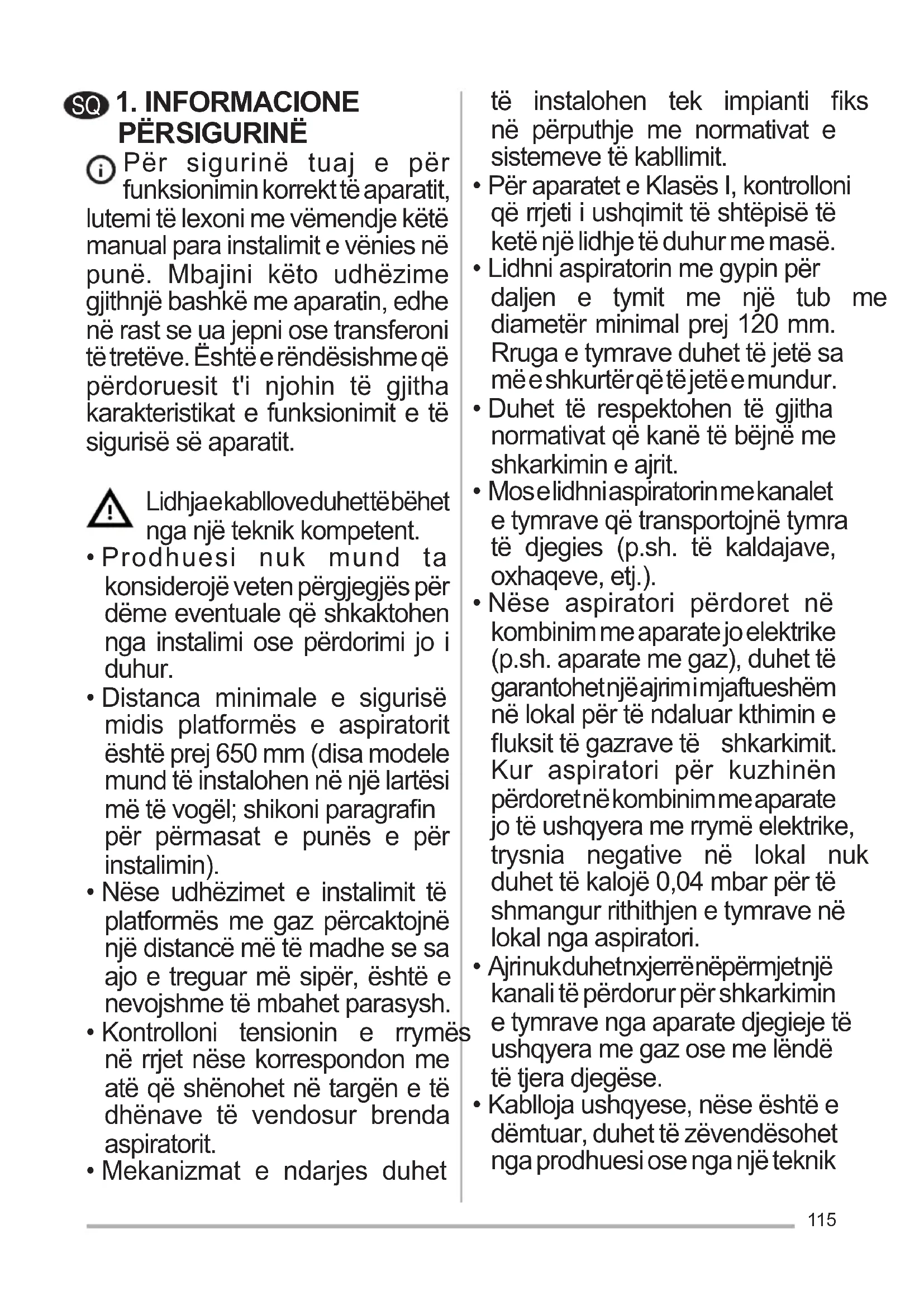 - Duhet të jetë i pranishëm një ajrim i mjaftueshëm në lokal kur aspiratori përdoret njëkohësisht me aparate që përdorin gaz ose lëndë të tjera djegëse (nuk mund t'u vihet aparateve që shkarkojnë vetëm ajrin në lokal).