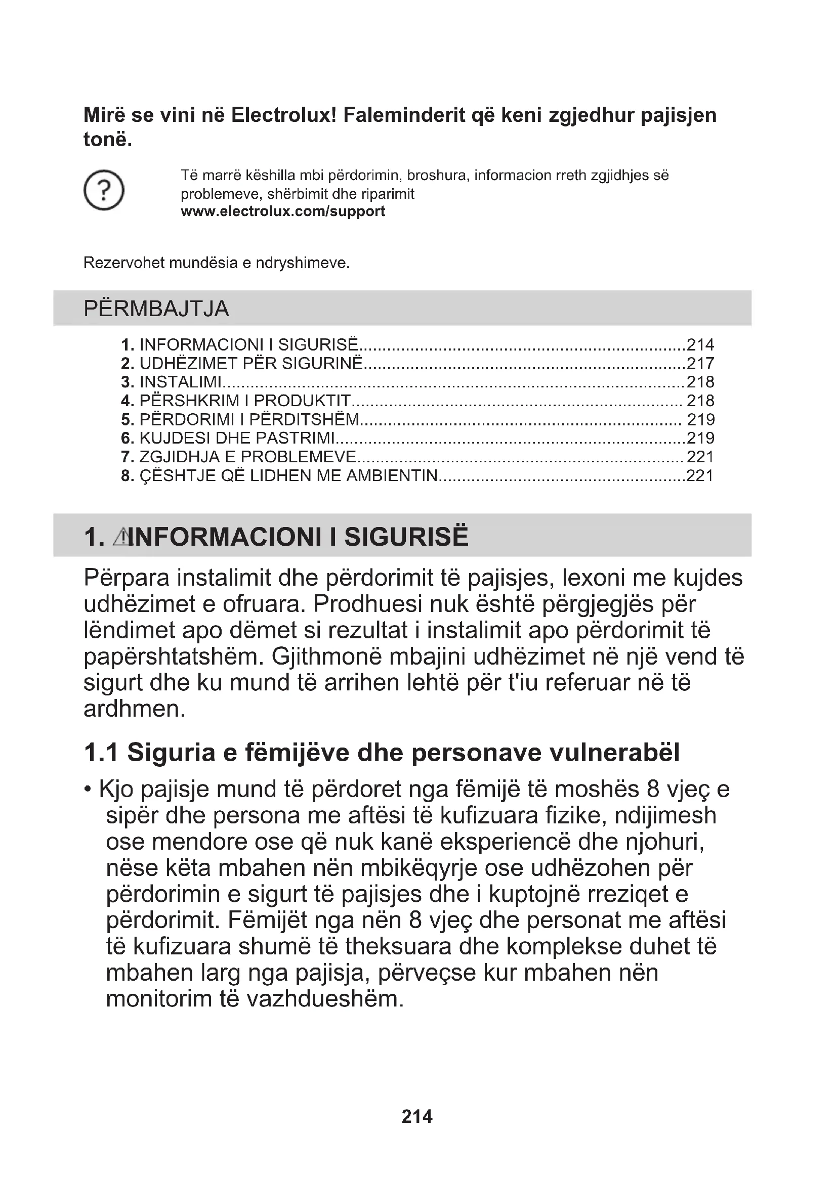 - Kjo pajisje mund të përdoret nga fëmijë të moshës 8 vjeç e sipër dhe persona me aftësi të kufizuara fizike, ndijimesh ose mendore ose që nuk kanë eksperiencë dhe njohuri, nëse këta mbahen nën mbikëqyrje ose udhëzohen për përdorimin e sigurt të pajisjes dhe i kuptojnë rreziqet e përdorimit. Fëmijët nga nën 8 vjeç dhe personat me aftësi të kufizuara shumë të theksuara dhe komplekse duhet të mbahen larg nga pajisja, përveçse kur mbahen nën monitorim të vazhdueshëm. 214• Fëmijët duhet të monitorohen për t'u siguruar se nuk luajnë me pajisjen.
