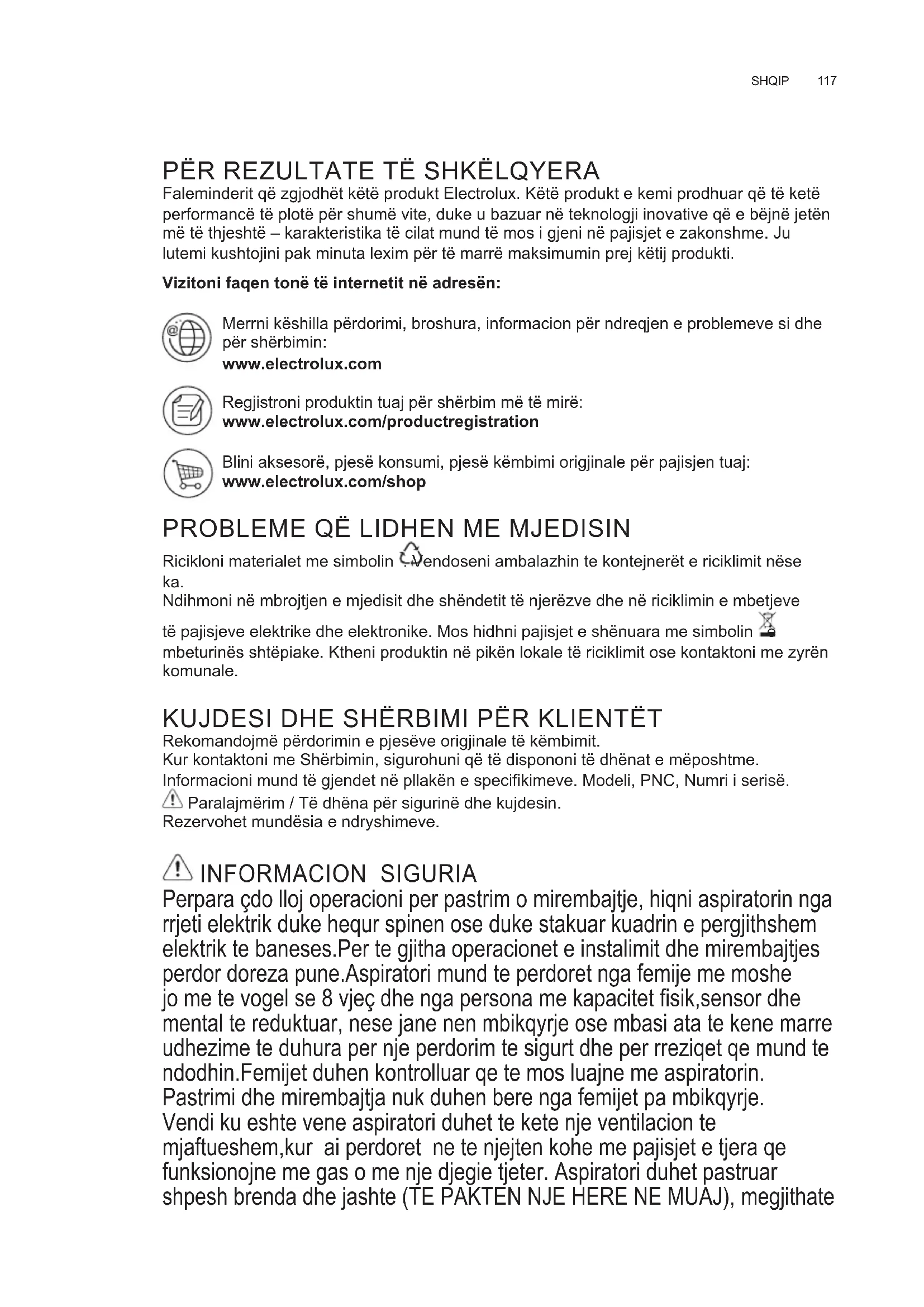 Ndihmoni në mbrojtjen e mjedisit dhe shëndetit të njerëzve dhe në riciklimin e mbetjeve të pajisjeve elektrike dhe elektronike Mos hidhni pajisjet e shënuara me simbolin e mbeturinës shtëpiake Ktheni produktin në pikën lokale të riciklimit ose kontaktoni me zyrën komunale KUJDESI DHE SHËRBIMI PËR KLIENTËT Rekomandojmë përdorimin e pjesëve origjinale të këmbimit Kur kontaktoni me Shërbimin, sigurohuni që të dispononi të dhënat e mëposhtme Informacioni mund të gjendet në pllakën e specikimeve. Modeli, PNC, Numri i serisë. Paralajmërim / Të dhëna për sigurinë dhe kujdesin Rezervohet mundësia e ndryshimeve INFORMACION SIGURIA Perpara çdo lloj operacioni per pastrim o mirembajtje, hiqni aspiratorin nga rrjeti elektrik duke hequr spinen ose duke stakuar kuadrin e pergjithshem elektrik te baneses.Per te gjitha operacionet e instalimit dhe mirembajtjes perdor doreza pune.Aspiratori mund te perdoret nga femije me moshe jo me te vogel se 8 vjeç dhe nga persona me kapacitet sik,sensor dhe mental te reduktuar, nese jane nen mbikqyrje ose mbasi ata te kene marre udhezime te duhura per nje perdorim te sigurt dhe per rreziqet qe mund te ndodhin.Femijet duhen kontrolluar qe te mos luajne me aspiratorin. Pastrimi dhe mirembajtja nuk duhen bere nga femijet pa mbikqyrje. Vendi ku eshte vene aspiratori duhet te kete nje ventilacion te mjaftueshem,kur ai perdoret ne te njejten kohe me pajisjet e tjera qe funksionojne me gas o me nje djegie tjeter. Aspiratori duhet pastruar shpesh brenda dhe jashte (TE PAKTEN NJE HERE NE MUAJ), megjithate SQ UDHËZUES PËR PËRDORIMINwww.electrolux.com