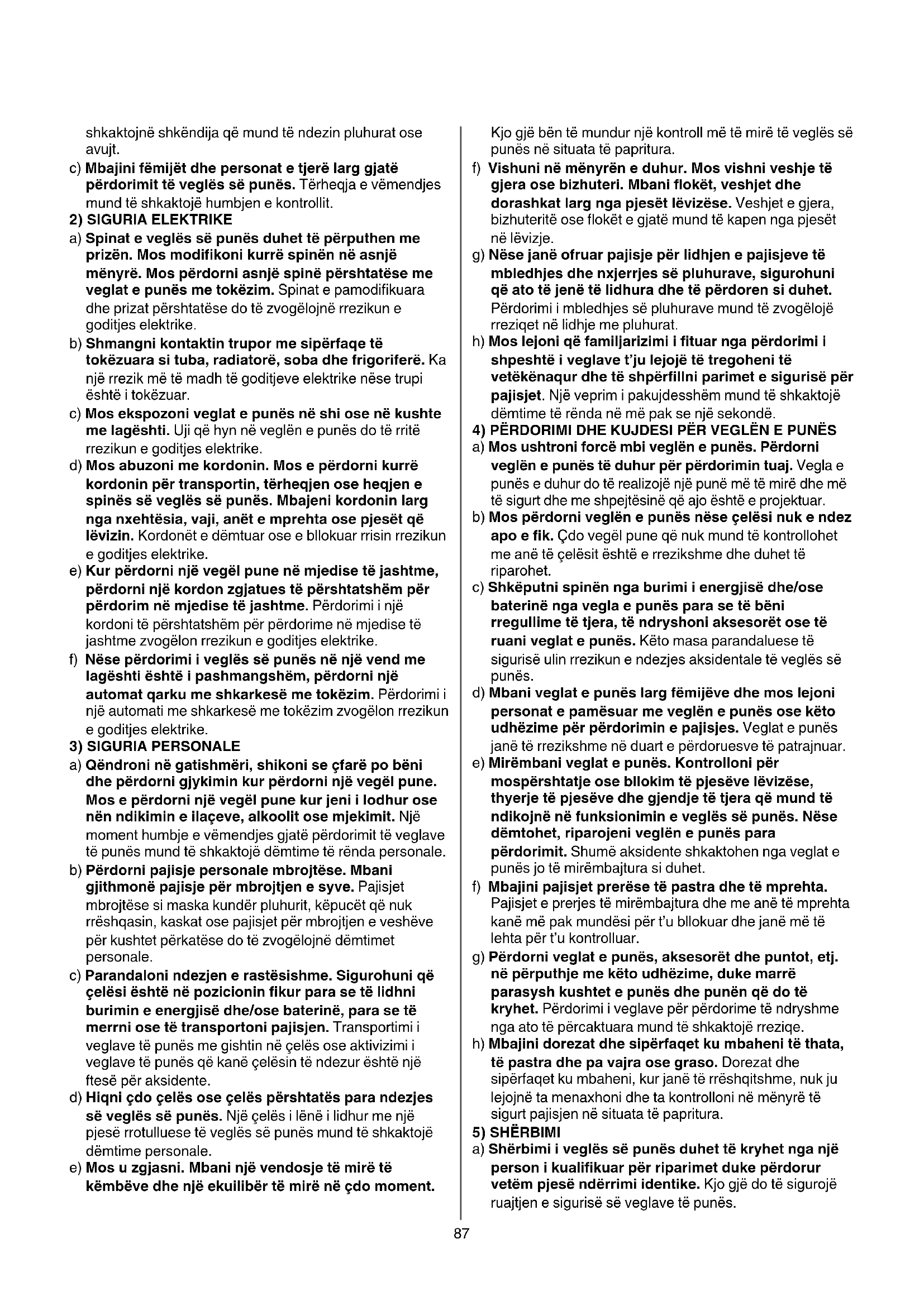 a) Mbajeni zonën e punës të pastër dhe të ndriçuar mirë. Zonat e çrregullta ose të errëta janë një ftesë për aksidente. b) Mos i përdorni pajisjet elektrike në situata me mundësi shpërthimi, si në prani të lëngjeve, gazeve ose pluhurave të djegshëm. Pajisjet elektrike87 shkaktojnë shkëndija që mund të ndezin pluhurat ose avujt. c) Mbajini fëmijët dhe personat e tjerë larg gjatë përdorimit të veglës së punës. Tërheqja e vëmendjes mund të shkaktojë humbjen e kontrollit.