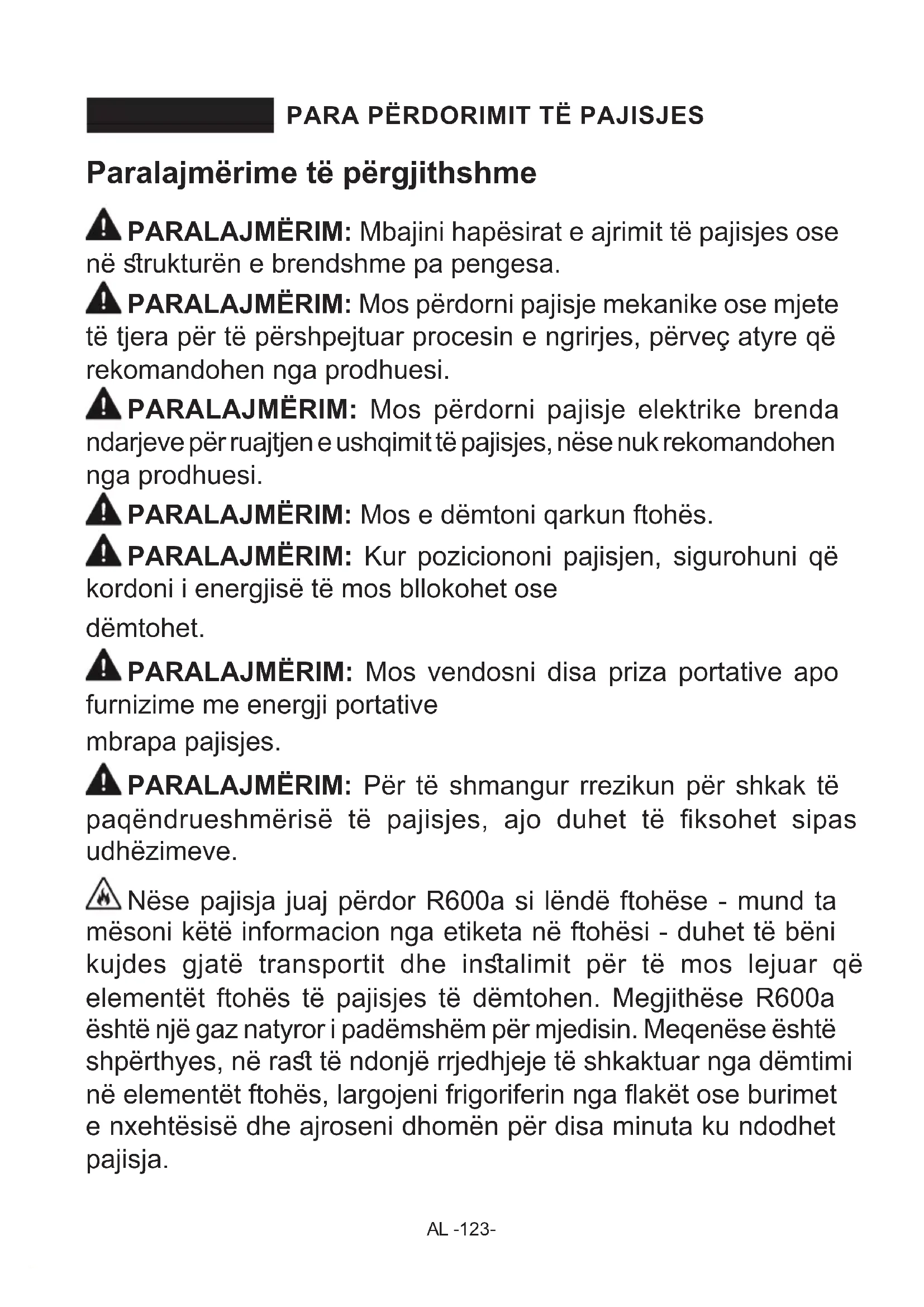 - PJESËT DHE ELEMENTET E FRIGORIFERIT AL -123- PARA PËRDORIMIT TË PAJISJES KAPITULLI - 1. Paralajmërime të përgjithshme PARALAJMËRIM: Mbajini hapësirat e ajrimit të pajisjes ose në rukturën e brendshme pa pengesa. PARALAJMËRIM: Mos përdorni pajisje mekanike ose mjete të tjera për të përshpejtuar procesin e ngrirjes, përveç atyre që rekomandohen nga prodhuesi. PARALAJMËRIM: Mos përdorni pajisje elektrike brenda ndarjeve për ruajtjen e ushqimit të pajisjes, nëse nuk rekomandohen nga prodhuesi. PARALAJMËRIM: Mos e dëmtoni qarkun ftohës. PARALAJMËRIM: Kur poziciononi pajisjen, sigurohuni që kordoni i energjisë të mos bllokohet ose dëmtohet. PARALAJMËRIM: Mos vendosni disa priza portative apo furnizime me energji portative mbrapa pajisjes. PARALAJMËRIM: Për të shmangur rrezikun për shkak të paqëndrueshmërisë të pajisjes, ajo duhet të ksohet sipas udhëzimeve. Nëse pajisja juaj përdor R600a si lëndë ftohëse - mund ta mësoni këtë informacion nga etiketa në ftohësi - duhet të bëni kujdes gjatë transportit dhe inalimit për të mos lejuar që elementët ftohës të pajisjes të dëmtohen. Megjithëse R600a është një gaz natyror i padëmshëm për mjedisin. Meqenëse është shpërthyes, në ra të ndonjë rrjedhjeje të shkaktuar nga dëmtimi në elementët ftohës, largojeni frigoriferin nga akët ose burimet e nxehtësisë dhe ajroseni dhomën për disa minuta ku ndodhet pajisja.AL -124- p. 148
