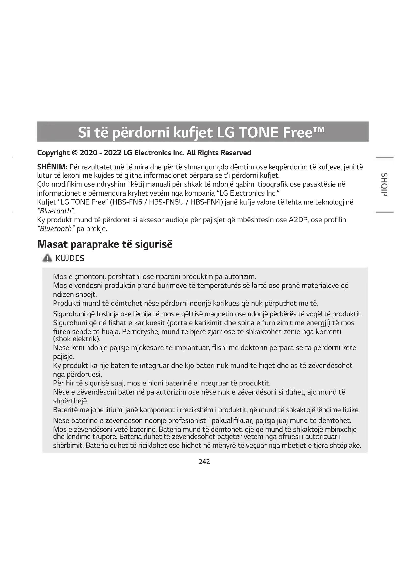 SHQIP Copyright © 2020 - 2022 LG Electronics Inc. All Rights Reserved SHËNIM: Për rezultatet më të mira dhe për të shmangur çdo dëmtim ose keqpërdorim të kufjeve, jeni të lutur të lexoni me kujdes të gjitha informacionet përpara se t’i përdorni kufjet. Çdo modifikim ose ndryshim i këtij manuali për shkak të ndonjë gabimi tipografik ose pasaktësie në informacionet e përmendura kryhet vetëm nga kompania “LG Electronics Inc.” Kufjet “LG TONE Free” (HBS-FN6 / HBS-FN5U / HBS-FN4) janë kufje valore të lehta me teknologjinë “Bluetooth”. Ky produkt mund të përdoret si aksesor audioje për pajisjet që mbështesin ose A2DP, ose profilin “Bluetooth” pa prekje. Masat paraprake të sigurisë