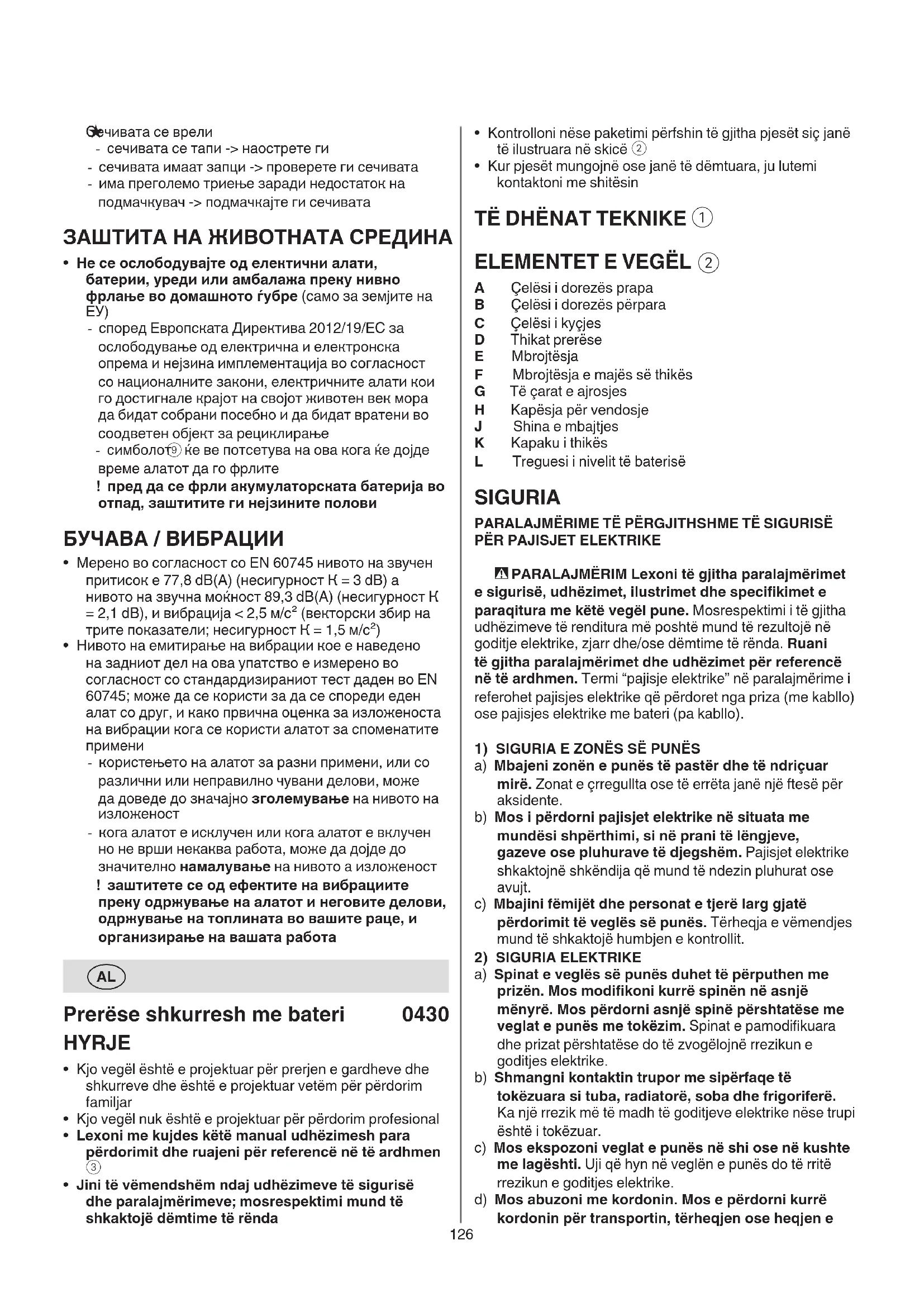 A Çelësi i dorezës prapa B Çelësi i dorezës përpara C Çelësi i kyçjes D Thikat prerëse E Mbrojtësja F Mbrojtësja e majës së thikës G Të çarat e ajrosjes H Kapësja për vendosje J Shina e mbajtjes K Kapaku i thikës L Treguesi i nivelit të baterisë SIGURIA PARALAJMËRIME TË PËRGJITHSHME TË SIGURISË