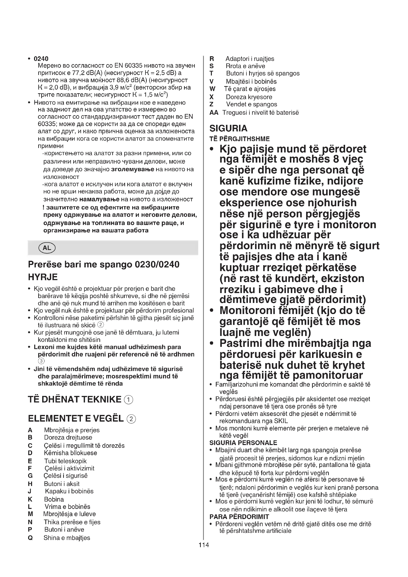 - Niveli i emetimit të vibrimit është matur në përputhje me një provë të standardizuar të dhënë në EN 60335; ajo mund të përdoret për të krahasuar një vegël me një tjetër dhe si një vlerësim paraprak i ekspozimit ndaj vibrimit kur përdorni pajisjen për proceset e përmendura - përdorimi i pajisjes për procese të ndryshme, ose me aksesorë të ndryshëm dhe të mirëmbajtur keq, mund të rritë ndjeshëm nivelin e ekspozimit - kohët kur pajisja është e kur dhe kur është e ndezur por jo në punë, mund të zvogëlojnë ndjeshëm nivelin e ekspozimit ! mbroni veten nga efektet e vibrimit duke mirëmbajtur pajisjen dhe aksesorët e saj, duke i mbajtur duart e ngrohta dhe duke organizuar mënyrën tuaj të punës