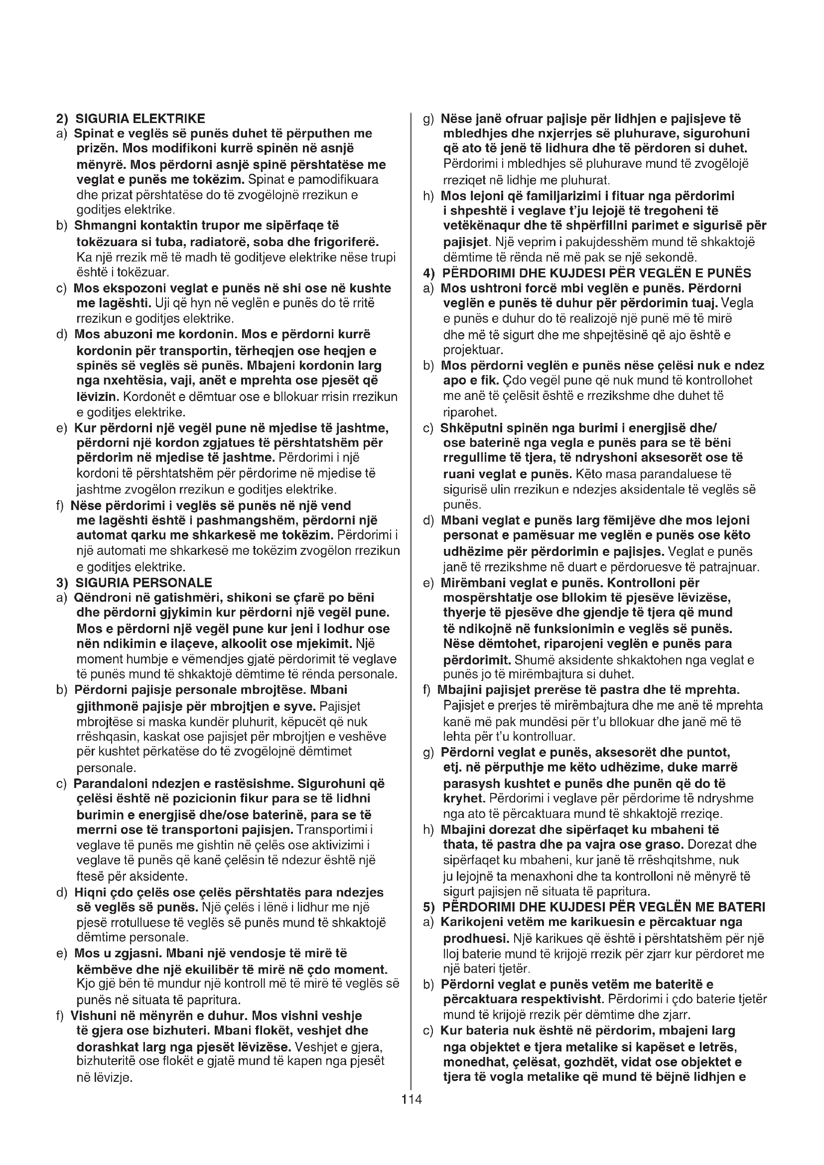 a) Qëndroni në gatishmëri, shikoni se çfarë po bëni dhe përdorni gjykimin kur përdorni një vegël pune. Mos e përdorni një vegël pune kur jeni i lodhur ose nën ndikimin e ilaçeve, alkoolit ose mjekimit. Një moment humbje e vëmendjes gjatë përdorimit të veglave të punës mund të shkaktojë dëmtime të rënda personale. b) Përdorni pajisje personale mbrojtëse. Mbani gjithmonë pajisje për mbrojtjen e syve. Pajisjet mbrojtëse si maska kundër pluhurit, këpucët që nuk rrëshqasin, kaskat ose pajisjet për mbrojtjen e veshëve për kushtet përkatëse do të zvogëlojnë dëmtimet personale. c) Parandaloni ndezjen e rastësishme. Sigurohuni që çelësi është në pozicionin kur para se të lidhni burimin e energjisë dhe/ose baterinë, para se të merrni ose të transportoni pajisjen. Transportimi i veglave të punës me gishtin në çelës ose aktivizimi i veglave të punës që kanë çelësin të ndezur është një ftesë për aksidente. d) Hiqni çdo çelës ose çelës përshtatës para ndezjes së veglës së punës. Një çelës i lënë i lidhur me një pjesë rrotulluese të veglës së punës mund të shkaktojë dëmtime personale. e) Mos u zgjasni. Mbani një vendosje të mirë të këmbëve dhe një ekuilibër të mirë në çdo moment. Kjo gjë bën të mundur një kontroll më të mirë të veglës së punës në situata të papritura. f) Vishuni në mënyrën e duhur. Mos vishni veshje të gjera ose bizhuteri. Mbani okët, veshjet dhe dorashkat larg nga pjesët lëvizëse. Veshjet e gjera, bizhuteritë ose okët e gjatë mund të kapen nga pjesët në lëvizje.115 respiratore për përdoruein ose personat përreth); mbani një maskë për pluhurat dhe punoni me një pajisje për heqjen e pluhurave kur mund të lidhet