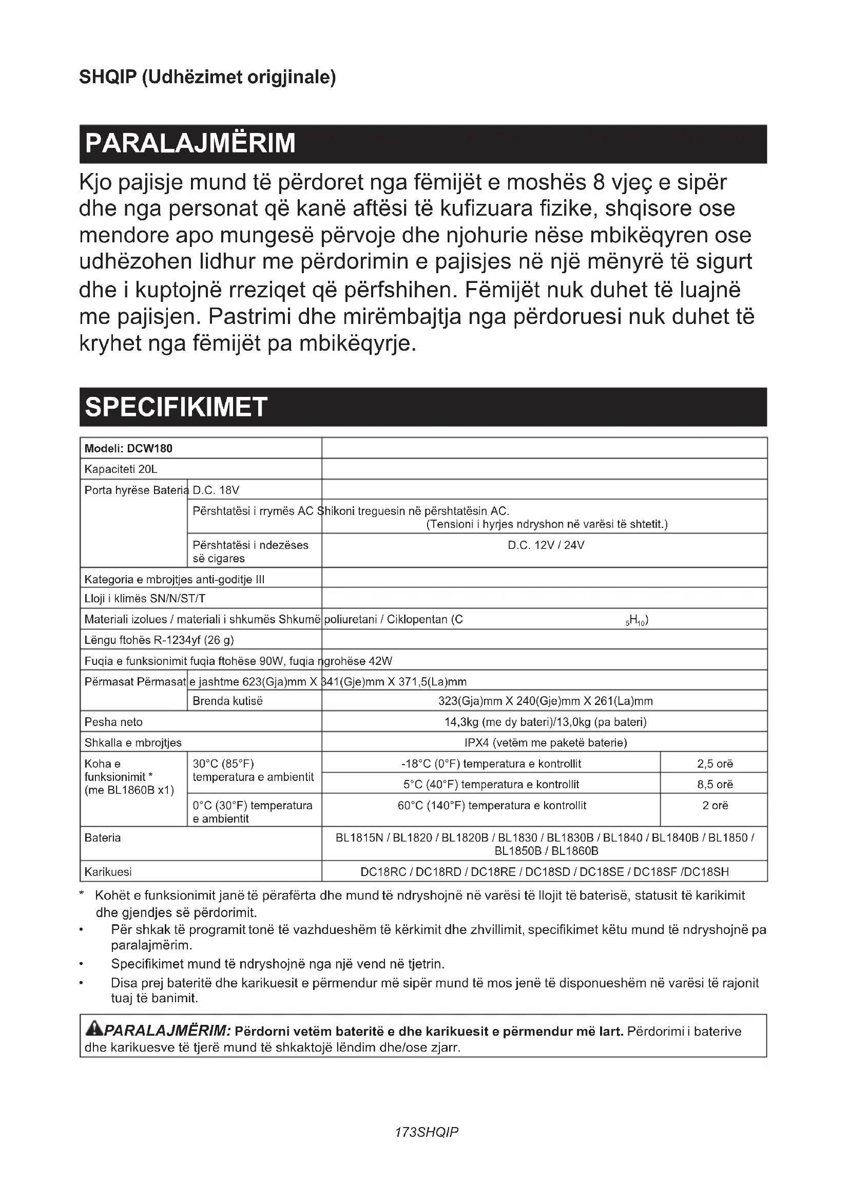 SHQIP (Udhëzimet origjinale) PARALAJMËRIM Kjo pajisje mund të përdoret nga fëmijët e moshës 8 vjeç e sipër dhe nga personat që kanë aftësi të kuzuara zike, shqisore ose mendore apo mungesë përvoje dhe njohurie nëse mbikëqyren ose udhëzohen lidhur me përdorimin e pajisjes në një mënyrë të sigurt dhe i kuptojnë rreziqet që përfshihen. Fëmijët nuk duhet të luajnë me pajisjen. Pastrimi dhe mirëmbajtja nga përdoruesi nuk duhet të kryhet nga fëmijët pa mbikëqyrje. SPECIFIKIMET Modeli: DCW180Kapaciteti 20LPorta hyrëse Bateria D.C. 18VPërshtatësi i rrymës AC Shikoni treguesin në përshtatësin AC.(Tensioni i hyrjes ndryshon në varësi të shtetit.)Përshtatësi i ndezëses së cigaresD.C. 12V / 24VKategoria e mbrojtjes anti-goditje IIILloji i klimës SN/N/ST/TMateriali izolues / materiali i shkumës Shkumë poliuretani / Ciklopentan (C