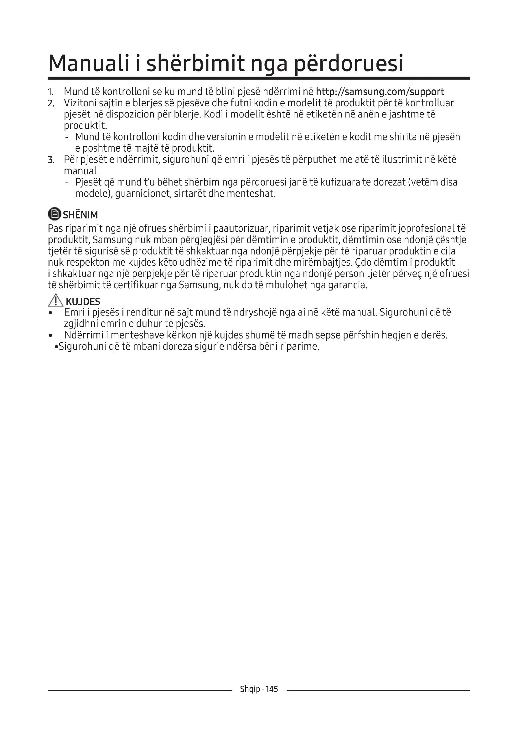manual. ‐ Pjesët që mund t’u bëhet shërbim nga përdoruesi janë të kufizuara te dorezat (vetëm disa modele), guarnicionet, sirtarët dhe menteshat. SHËNIM Pas riparimit nga një ofrues shërbimi i paautorizuar, riparimit vetjak ose riparimit joprofesional të produktit, Samsung nuk mban përgjegjësi për dëmtimin e produktit, dëmtimin ose ndonjë çështje tjetër të sigurisë së produktit të shkaktuar nga ndonjë përpjekje për të riparuar produktin e cila nuk respekton me kujdes këto udhëzime të riparimit dhe mirëmbajtjes. Çdo dëmtim i produktit ishkaktuar nga një përpjekje për të riparuar produktin nga ndonjë person tjetër përveç një ofruesi të shërbimit të certifikuar nga Samsung, nuk do të mbulohet nga garancia. KUJDES