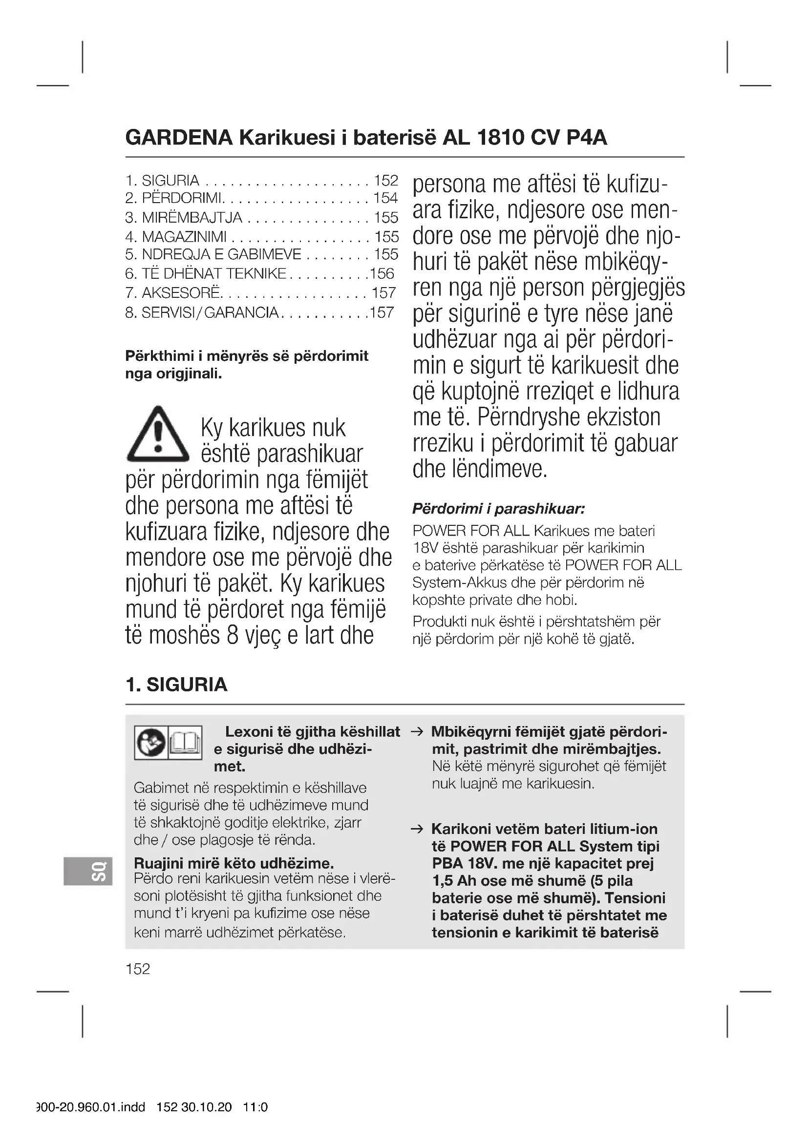 Përkthimi i mënyrës së përdorimit nga origjinali. Ky karikues nuk është parashikuar për përdorimin nga fëmijët dhe persona me aftësi të kufizuara fizike, ndjesore dhe mendore ose me përvojë dhe njohuri të pakët. Ky karikues mund të përdoret nga fëmijë të moshës 8 vjeç e lart dhe persona me aftësi të kufizu- ara fizike, ndjesore ose men- dore ose me përvojë dhe njo- huri të pakët nëse mbikëqy- ren nga një person përgjegjës për sigurinë e tyre nëse janë udhëzuar nga ai për përdori- min e sigurt të karikuesit dhe që kuptojnë rreziqet e lidhura me të. Përndryshe ekziston rreziku i përdorimit të gabuar dhe lëndimeve. Përdorimi i parashikuar: POWER FOR ALL Karikues me bateri 18V është parashikuar për karikimin ebaterive përkatëse të POWER FOR ALL System-Akkus dhe për përdorim në kopshte private dhe hobi. Produkti nuk është i përshtatshëm për një përdorim për një kohë të gjatë. 14900-20.960.01.indd 152 30.10.20 11:08SQ