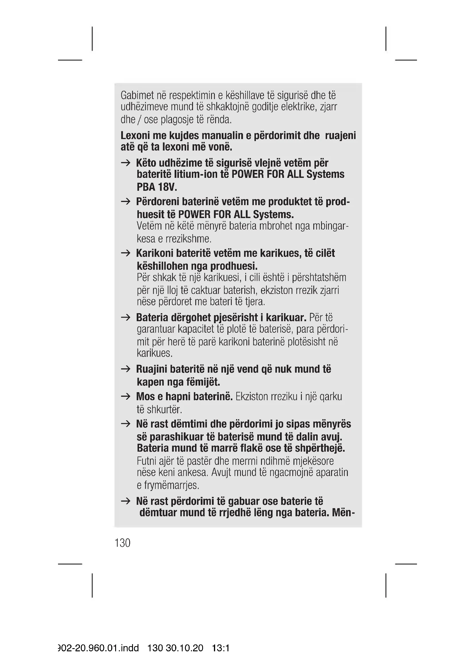 14902-20.960.01.indd 129 30.10.20 13:19Gabimet në respektimin e këshillave të sigurisë dhe të udhëzimeve mund të shkaktojnë goditje elektrike, zjarr dhe / ose plagosje të rënda. Lexoni me kujdes manualin e përdorimit dhe ruajeni atë që ta lexoni më vonë. v Këto udhëzime të sigurisë vlejnë vetëm për bateritë litium-ion të POWER FOR ALL Systems PBA 18V. v Përdoreni baterinë vetëm me produktet të prod- huesit të POWER FOR ALL Systems. Vetëm në këtë mënyrë bateria mbrohet nga mbingar- kesa e rrezikshme. v Karikoni bateritë vetëm me karikues, të cilët këshillohen nga prodhuesi. Për shkak të një karikuesi, i cili është i përshtatshëm për një lloj të caktuar baterish, ekziston rrezik zjarri nëse përdoret me bateri të tjera. v Bateria dërgohet pjesërisht i karikuar. Për të garantuar kapacitet të plotë të baterisë, para përdori- mit për herë të parë karikoni baterinë plotësisht në karikues. v Ruajini bateritë në një vend që nuk mund të kapen nga fëmijët. v Mos e hapni baterinë. Ekziston rreziku i një qarku të shkurtër. v Në rast dëmtimi dhe përdorimi jo sipas mënyrës së parashikuar të baterisë mund të dalin avuj. Bateria mund të marrë flakë ose të shpërthejë. Futni ajër të pastër dhe merrni ndihmë mjekësore nëse keni ankesa. Avujt mund të ngacmojnë aparatin e frymëmarrjes. v Në rast përdorimi të gabuar ose baterie të dëmtuar mund të rrjedhë lëng nga bateria. Mën-