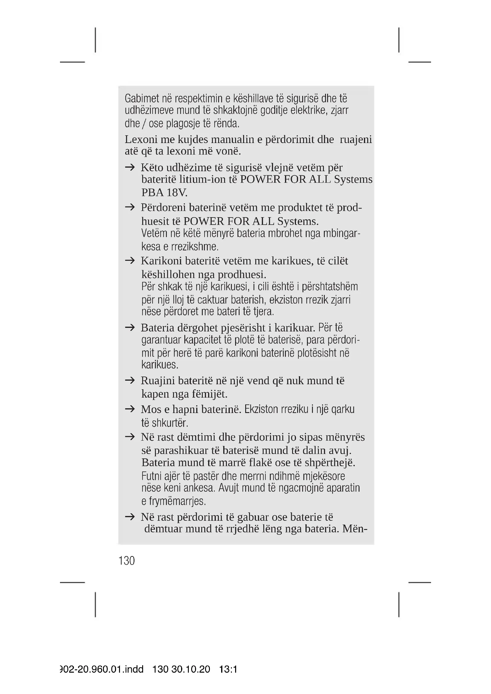 14902-20.960.01.indd 129 30.10.20 13:19Gabimet në respektimin e këshillave të sigurisë dhe të udhëzimeve mund të shkaktojnë goditje elektrike, zjarr dhe / ose plagosje të rënda. Lexoni me kujdes manualin e përdorimit dhe ruajeni atë që ta lexoni më vonë. v Këto udhëzime të sigurisë vlejnë vetëm për bateritë litium-ion të POWER FOR ALL Systems PBA 18V. v Përdoreni baterinë vetëm me produktet të prod- huesit të POWER FOR ALL Systems. Vetëm në këtë mënyrë bateria mbrohet nga mbingar- kesa e rrezikshme. v Karikoni bateritë vetëm me karikues, të cilët këshillohen nga prodhuesi. Për shkak të një karikuesi, i cili është i përshtatshëm për një lloj të caktuar baterish, ekziston rrezik zjarri nëse përdoret me bateri të tjera. v Bateria dërgohet pjesërisht i karikuar. Për të garantuar kapacitet të plotë të baterisë, para përdori- mit për herë të parë karikoni baterinë plotësisht në karikues. v Ruajini bateritë në një vend që nuk mund të kapen nga fëmijët. v Mos e hapni baterinë. Ekziston rreziku i një qarku të shkurtër. v Në rast dëmtimi dhe përdorimi jo sipas mënyrës së parashikuar të baterisë mund të dalin avuj. Bateria mund të marrë flakë ose të shpërthejë. Futni ajër të pastër dhe merrni ndihmë mjekësore nëse keni ankesa. Avujt mund të ngacmojnë aparatin e frymëmarrjes. v Në rast përdorimi të gabuar ose baterie të dëmtuar mund të rrjedhë lëng nga bateria. Mën-