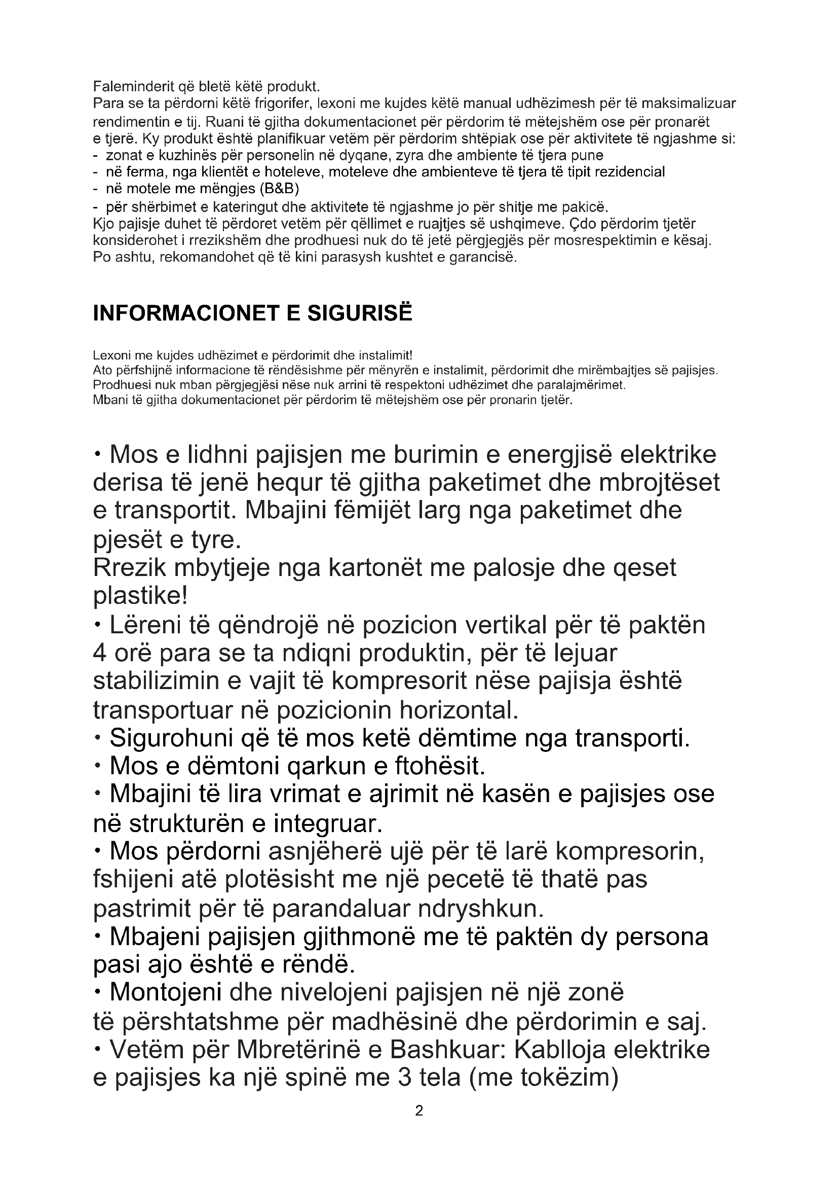 Faleminderit që bletë këtë produkt. Para se ta përdorni këtë frigorifer, lexoni me kujdes këtë manual udhëzimesh për të maksimalizuar rendimentin e tij. Ruani të gjitha dokumentacionet për përdorim të mëtejshëm ose për pronarët e tjerë. Ky produkt është planifikuar vetëm për përdorim shtëpiak ose për aktivitete të ngjashme si: - zonat e kuzhinës për personelin në dyqane, zyra dhe ambiente të tjera pune - në ferma, nga klientët e hoteleve, moteleve dhe ambienteve të tjera të tipit rezidencial - në motele me mëngjes (B&B) - për shërbimet e kateringut dhe aktivitete të ngjashme jo për shitje me pakicë. Kjo pajisje duhet të përdoret vetëm për qëllimet e ruajtjes së ushqimeve. Çdo përdorim tjetër konsiderohet i rrezikshëm dhe prodhuesi nuk do të jetë përgjegjës për mosrespektimin e kësaj. Po ashtu, rekomandohet që të kini parasysh kushtet e garancisë.