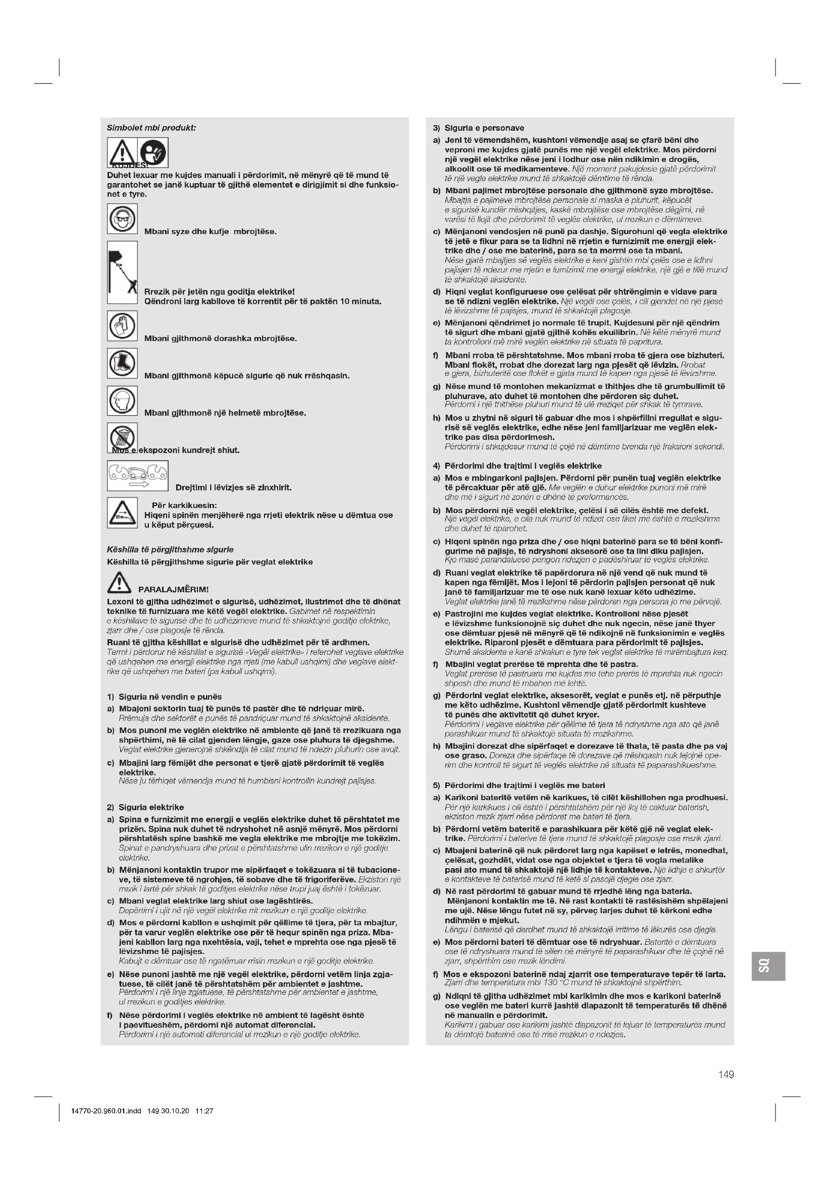 Drejtimi i lëvizjes së zinxhirit. Për karkikuesin: Hiqeni spinën menjëherë nga rrjeti elektrik nëse u dëmtua ose u këput përçuesi. Këshilla të përgjithshme sigurie Këshilla të përgjithshme sigurie për veglat elektrike PARALAJMËRIM! Lexoni të gjitha udhëzimet e sigurisë, udhëzimet, ilustrimet dhe të dhënat teknike të furnizuara me këtë vegël elektrike. Gabimet në respektimin e këshillave të sigurisë dhe të udhëzimeve mund të shkaktojnë goditje elektrike, zjarr dhe / ose plagosje të rënda. Ruani të gjitha këshillat e sigurisë dhe udhëzimet për të ardhmen. Termi i përdorur në këshillat e sigurisë «Vegël elektrike» i referohet veglave elektrike që ushqehen me energji elektrike nga rrjeti (me kabull ushqimi) dhe veglave elekt- rike që ushqehen me bateri (pa kabull ushqimi).