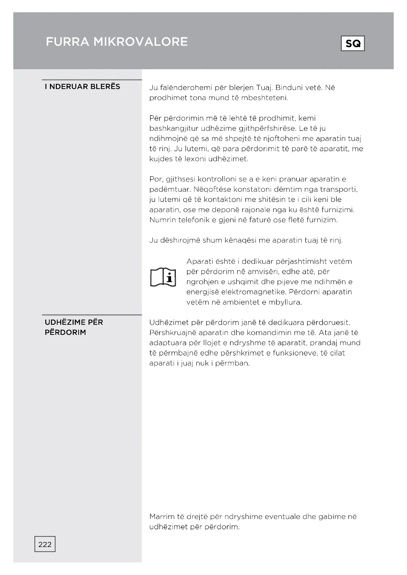 a) перевірте, чи встановлено таймер. б) впевніться, що дверцята закрито належним чином. Інакше мікрохвильова енергія не поступатиме до печі. Якщо ви не можете усунути вищезазначені пошкодження самостійно, зв'яжіться з найближчим авторизованим сервісним центром. ПЕРЕД ДЗВІНКОМ ДО СЕРВІСНОГО ЦЕНТРУ222 Ju falënderohemi për blerjen Tuaj. Binduni vetë. Në prodhimet tona mund të mbeshteteni. Për përdorimin më të lehtë të prodhimit, kemi bashkangjitur udhëzime gjithpërfshirëse. Le të ju ndihmojnë që sa më shpejtë të njoftoheni me aparatin tuaj të rinj. Ju lutemi, që para përdorimit të parë të aparatit, me kujdes të lexoni udhëzimet. Por, gjithsesi kontrolloni se a e keni pranuar aparatin e padëmtuar. Nëqoftëse konstatoni dëmtim nga transporti, ju lutemi që të kontaktoni me shitësin te i cili keni ble aparatin, ose me deponë rajonale nga ku është furnizimi. Numrin telefonik e gjeni në faturë ose fletë furnizim. Ju dëshirojmë shum kënaqësi me aparatin tuaj të rinj. Aparati është i dedikuar përjashtimisht vetëm për përdorim në amvisëri, edhe atë, për ngrohjen e ushqimit dhe pijeve me ndihmën e energjisë elektromagnetike. Përdorni aparatin vetëm në ambientet e mbyllura. Udhëzimet për përdorim janë të dedikuara përdoruesit. Përshkruajnë aparatin dhe komandimin me të. Ata janë të adaptuara për llojet e ndryshme të aparatit, prandaj mund të përmbajnë edhe përshkrimet e funksioneve, të cilat aparati i juaj nuk i përmban. Marrim të drejtë për ndryshime eventuale dhe gabime në udhëzimet për përdorim.