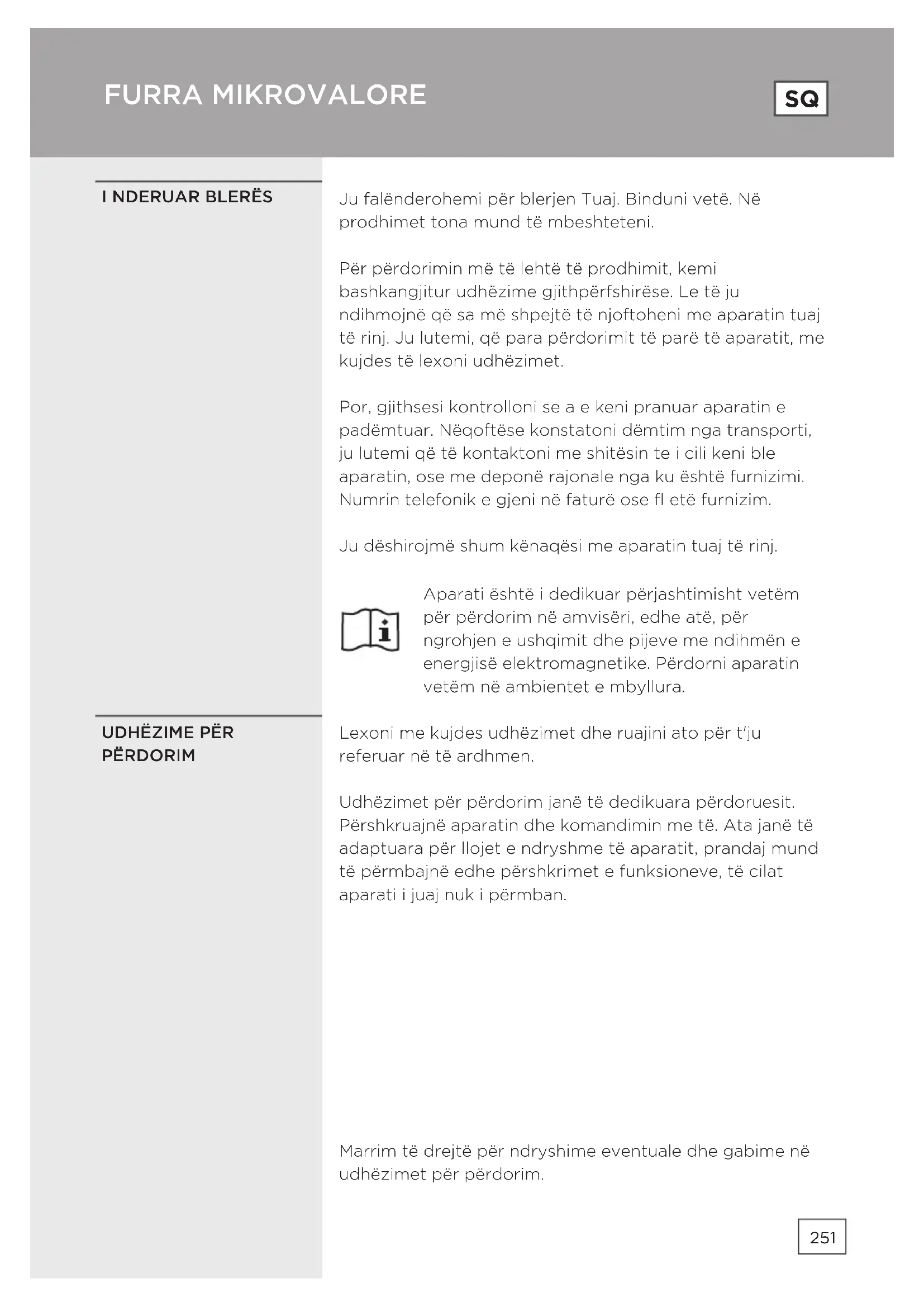 PËRDORIM FURRA MIKROVALORE252 Kurrë mos prekni sipërfaqet e aparateve për nxehje ose për gatim. Te funksionimi, ata nxehen. Sipërfaqet e brendshme të aparatit dhe elementet për nxehje shum tejnxehen. Rrezik i djegëjes! Mos lejoni fëmijt afër. Burimi i mikrovalëve dhe tensionit të lartë! Mos hiqni kapakun. PARALAJMËRIM! Gjatë përdorimit, aparati i amvisërisë dhe pjesët e tij tejnxehen. Nevojitet të kujdesemi që të mos prekim sipërfaqet e nxehta. Fëmijt me moshë më të ulët se 8 vjet të mos qëndrojnë në afërsi të mbaresës, përveç nëqoftëse i mbikqyrni tërë kohën. Aparatin e amvisërisë mund të përdorin fëmijt me moshë mbi 8 vjeçare si dhe fëmijt me aftësitë e zvogëluara trupore, ndjesore ose shpirtërore, ose ata persona që kanë përvojë të mangshme, resp. njohuri, mbikqyrje ose udhëzime sa i takon përdorimit të aparatit në mënyrë të sigurtë dhe se janë të vetëdijshëm për rrezikun e përdorimit. Te përdorimi i aparatit, mbikqyrni fëmijt dhe keni kujdes që ata të mos lozin me aparatin. Fëmijt nuk kanë të drejtë të pastrojnë dhe mirëmbajnë mbaresën, përveç nëqoftëse janë në moshë mbi 8 vjeçare dhe se janë të mbikqyrur. Kujdeseni që aparati dhe kablloja kyçëse të mos jenë qasëse fëmijve më të rinj se 8 vjet.